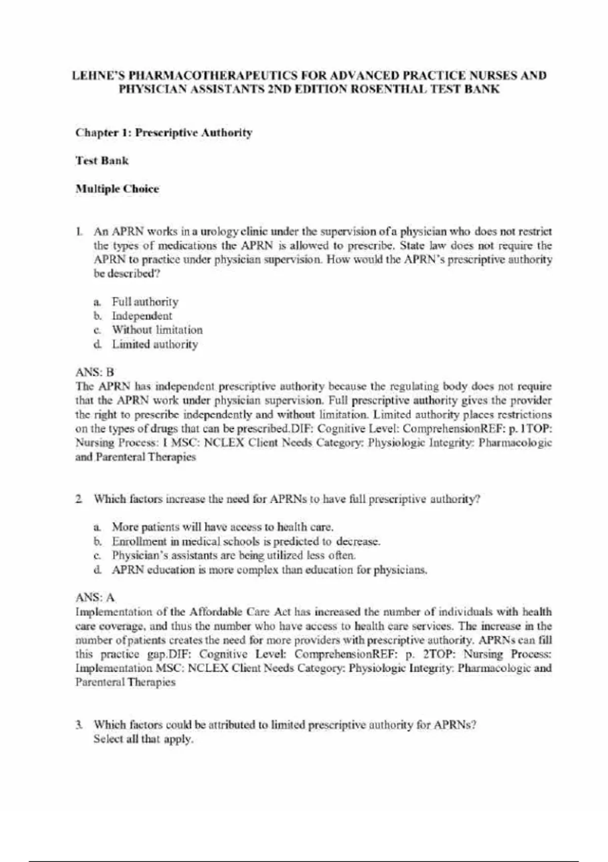 Test Bank LEHNE-S PHARMACOTHERAPEUTICS for Advanced Practice Nurses and Physician Assistants 2nd Edition Rosenthal Final Assessment Questions and Answers.pdf