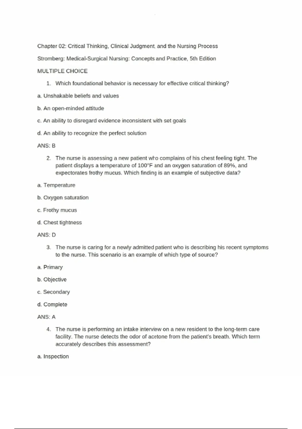 Comprehensive NUR 202 Chapter 2: Critical Thinking, Clinical Judgment, and the Nursing Process test bank from Stromberg: Medical-Surgical Nursing – Concepts and Practice (5th Edition). This document includes multiple-choice questions with verified answers, covering essential topics such as nursing assessment, subjective vs. objective data, HIPAA compliance, nursing process steps, problem statements, and goal setting. Ideal for Med-Surg nursing exams, NCLEX-RN, LPN/LVN, and clinical reasoning preparation. Perfect for students seeking practice questions, rationales, and nursing process review to strengthen critical thinking and clinical decision-making. Updated for current nursing programs and fall 2025 study guides.Detailed NUR 202 Chapter 2: Critical Thinking, Clinical Judgment, and the Nursing Process test bank from Stromberg: Medical-Surgical Nursing – Concepts and Practice, 5th Edition. This complete exam review includes multiple-choice questions with correct answers and rationales focused on critical thinking, nursing process steps, data collection, clinical judgment, and professional nursing practice. Perfect for Med-Surg nursing exams, NCLEX-RN, LPN/LVN reviews, and nursing fundamentals courses. Topics covered include subjective vs. objective data, assessment techniques, HIPAA compliance, problem statements, nursing diagnoses, and goal/outcome planning. Ideal for students preparing for Stromberg textbook quizzes, unit tests, or final exams. Helps boost clinical reasoning, decision-making, and nursing care plan development. Updated for 2024–2025 nursing curriculum — great for those using Coursehero, Chamberlain, or ATI review materials to study smarter and score higher.