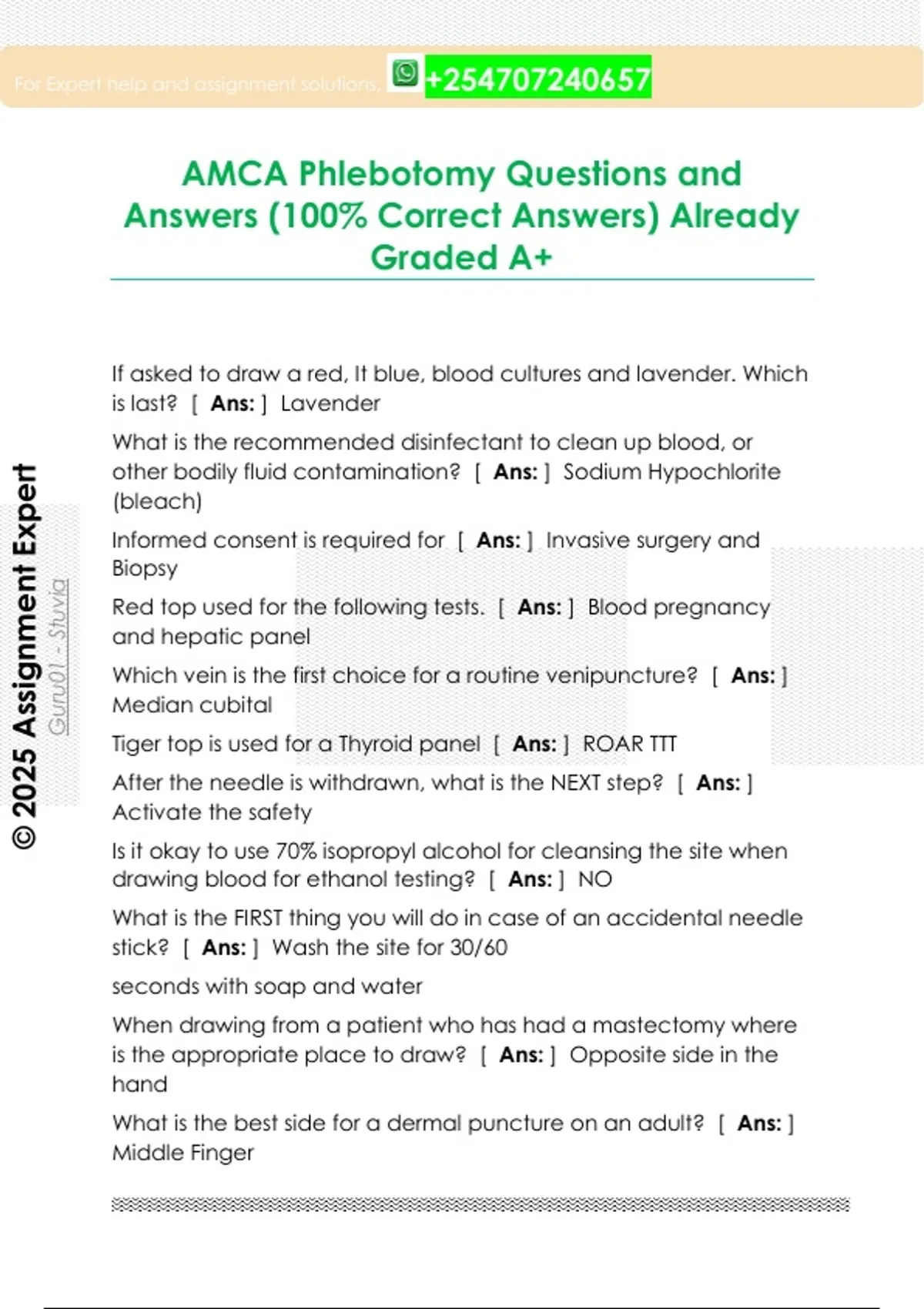 AMCA Phlebotomy Questions and Answers (100% Correct Answers) Already Graded A+