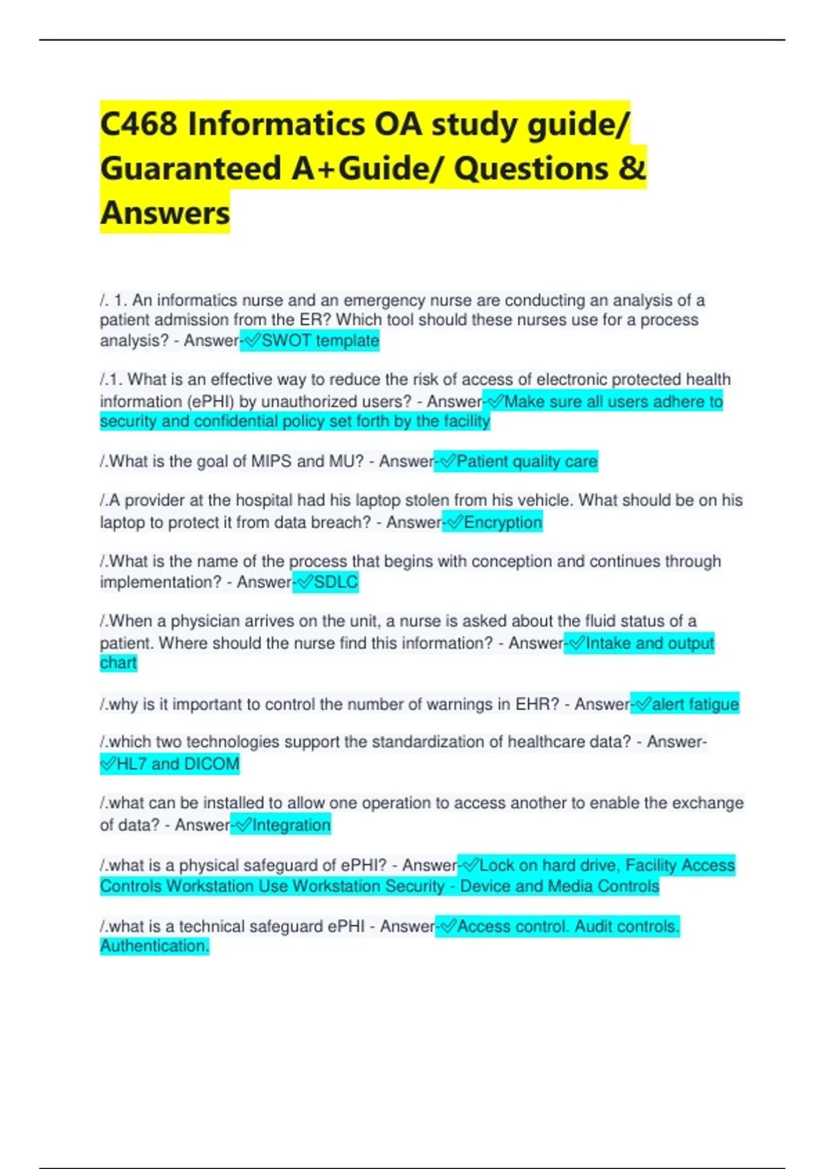 C468 Informatics OA study guide/ Guaranteed A+ Guide / Questions & Answers /. 1. An informatics nurse and an emergency nurse are conducting an analysis of a patient admission from the ER? Which tool should these nurses use for a process analysis? - Answer-SWOT template /.1. What is an effective way to reduce the risk of access of electronic protected health information (ePHI) by unauthorized users? - Answer-Make sure all users adhere to security and confidential policy set forth by the facility /.What is the goal of MIPS and MU? - Answer-Patient quality care /.A provider at the hospital had his laptop stolen from his vehicle. What should be on his laptop to protect it from data breach? - Answer-Encryption /.What is the name of the process that begins with conception and continues through implementation? - Answer-SDLC /.When a physician arrives on the unit, a nurse is asked about the fluid status of a patient. Where should the nurse find this information? - Answer-Intake and output chart /.why is it important to control the number of warnings in EHR? - Answer-alert fatigue /.which two technologies support the standardization of healthcare data? - Answer-HL7 and DICOM /.what can be installed to allow one operation to access another to enable the exchange of data? - Answer-Integration /.what is a physical safeguard of ePHI? - Answer-Lock on hard drive, Facility Access Controls Workstation Use Workstation Security - Device and Media Controls /.what is a technical safeguard ePHI - Answer-Access control. Audit controls. Authentication. /.An informatics nurse and an ER nurse are conducting an analysis of a patient admission form the er. which tool should these nurses use for a process analysis? - Answer-SWOT /.1. an informatics nurse is developing a web-based application for patient care. which statement accurately describes the internet? - Answer-A Network or networks /.1. what describes an example of opt-in or opt-out choice regarding the disclosure of personal health information? - Answer-your information sent to another facility /.which government organization oversees the meaningful use program? - Answer-CMS /.What item describes a basic network code that determines the roles used to create and route packets of data between network devices? - Answer-Interface /.1. Which is a physician's clinical informatics assessment? - Answer-Vital signs /.1. The Operating room uses a different system than what is integrated in the EMR. What do you do? - Answer-chart in one system and it will automatically show up in both systems /.1. There are different systems for L &D and the hospital, how would you check for orders and medications? - Answer-Log out of L&D system and log into the Hospital system /.What should providers have on their personal mobile devices to protect it from sharing information when stolen? - Answer-Authentication and encryption. /.1. What are two barriers of adopting the CDS in an EHR? - Answer-Limited resource Communication information exchange /.1. What should healthcare staff who use mobile devices to access ePHI do to protect devices before they are lost or stolen? - Answer-. Turn off share files. /.Which stage of the SDLC would data be collected from the systems users regarding their analysis - Answer-Needs /.Which phase of the system life cycle involves using needs assessment to identify the exportation of the system? - Answer-Needs/Design /.Which MIPS merit-based incentive payment system performance replaces MU for physicians? - Answer-HITCECH act