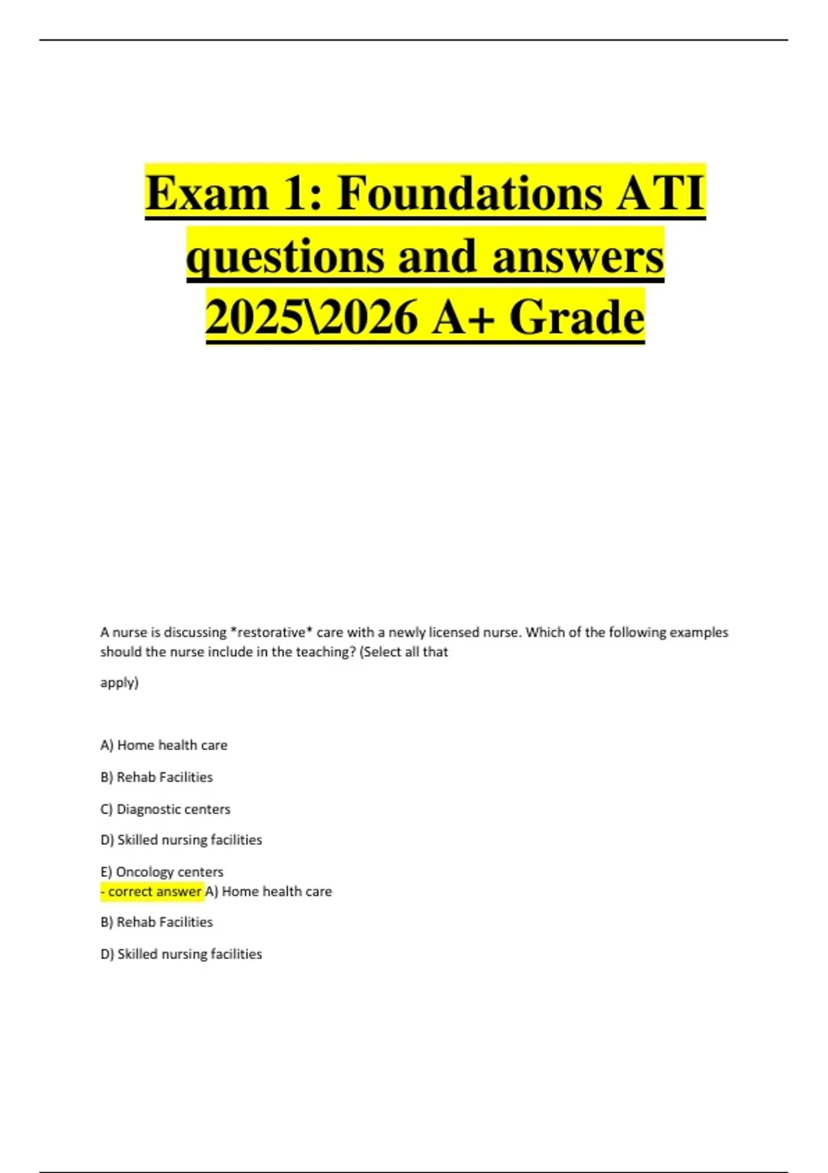 This document provides a complete set of Foundations ATI Exam 1 questions with verified answers for the 2025/2026 academic year. It covers essential nursing fundamentals, including patient care, safety, ethics, and clinical procedures. Designed to support nursing students in mastering foundational ATI topics, this resource ensures thorough preparation for exams and practical assessments.