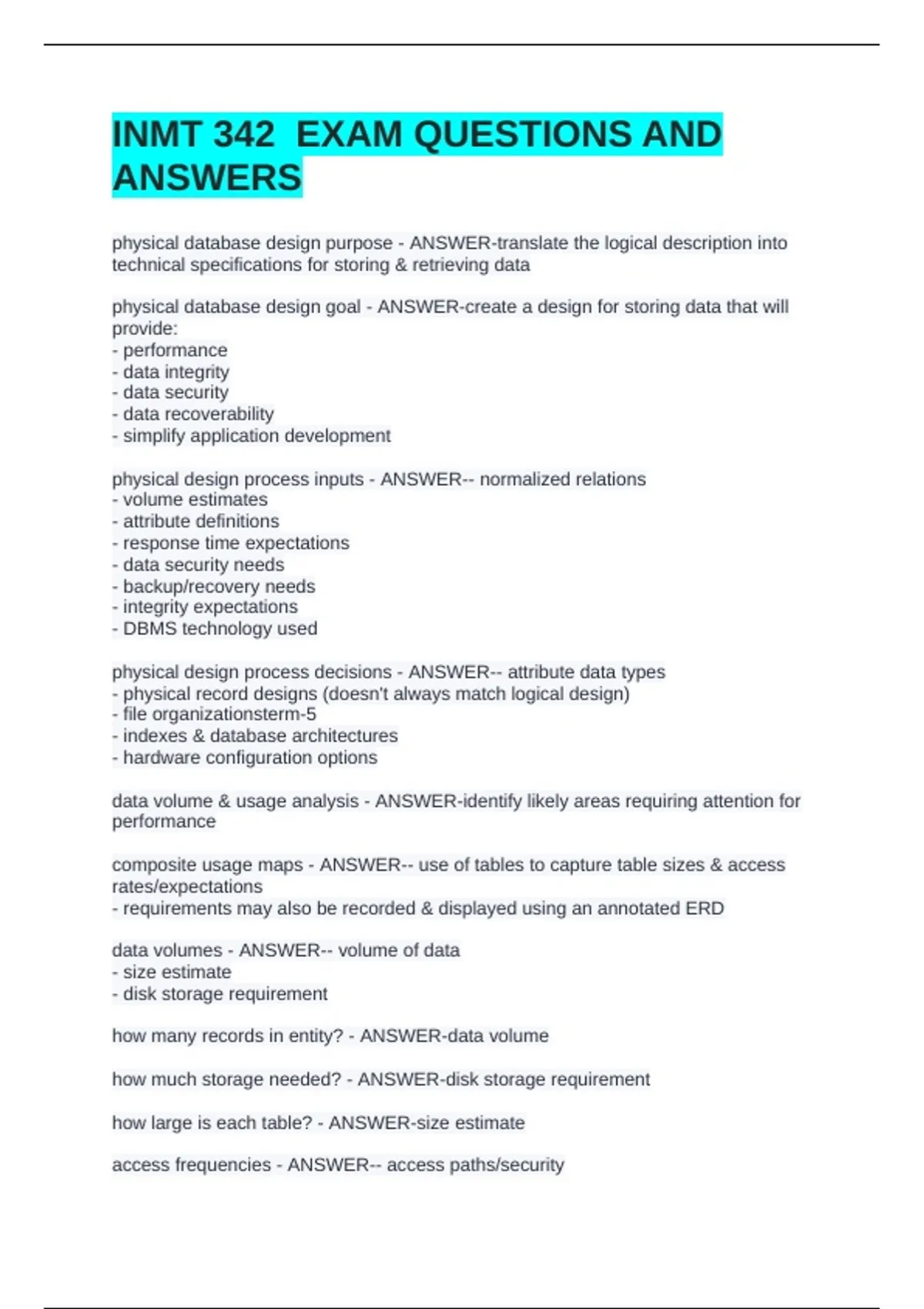 INMT 342 EXAM QUESTIONS AND ANSWERS physical database design purpose - ANSWER-translate the logical description into technical specifications for storing & retrieving data physical database design goal - ANSWER-create a design for storing data that will provide: - performance - data integrity - data security - data recoverability - simplify application development physical design process inputs - ANSWER-- normalized relations - volume estimates - attribute definitions - response time expectations - data security needs - backup/recovery needs - integrity expectations - DBMS technology used physical design process decisions - ANSWER-- attribute data types - physical record designs (doesn't always match logical design) - file organizationsterm-5 - indexes & database architectures - hardware configuration options data volume & usage analysis - ANSWER-identify likely areas requiring attention for performance composite usage maps - ANSWER-- use of tables to capture table sizes & access rates/expectations - requirements may also be recorded & displayed using an annotated ERD data volumes - ANSWER-- volume of data - size estimate - disk storage requirement how many records in entity? - ANSWER-data volume how much storage needed? - ANSWER-disk storage requirement how large is each table? - ANSWER-size estimate access frequencies - ANSWER-- access paths/security