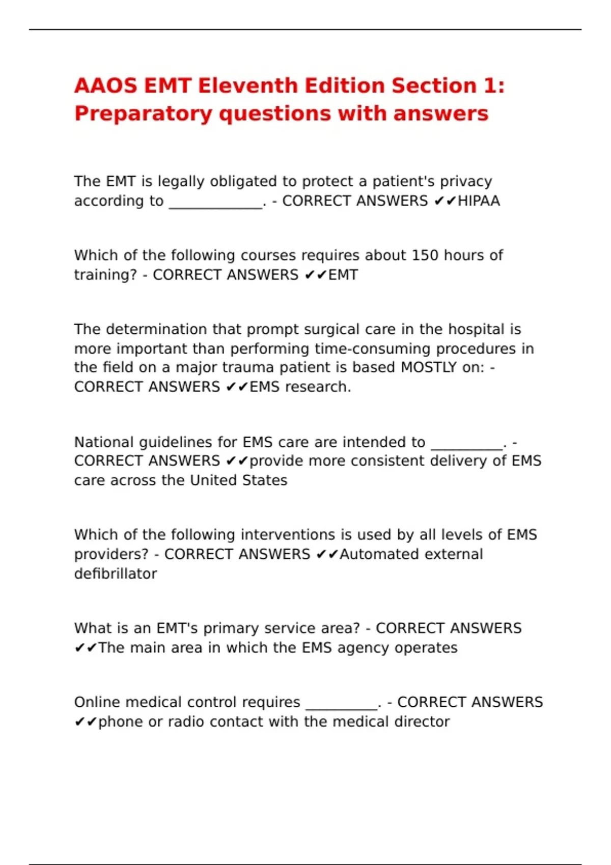 AAOS EMT Eleventh Edition Section 1- Preparatory questions with answers