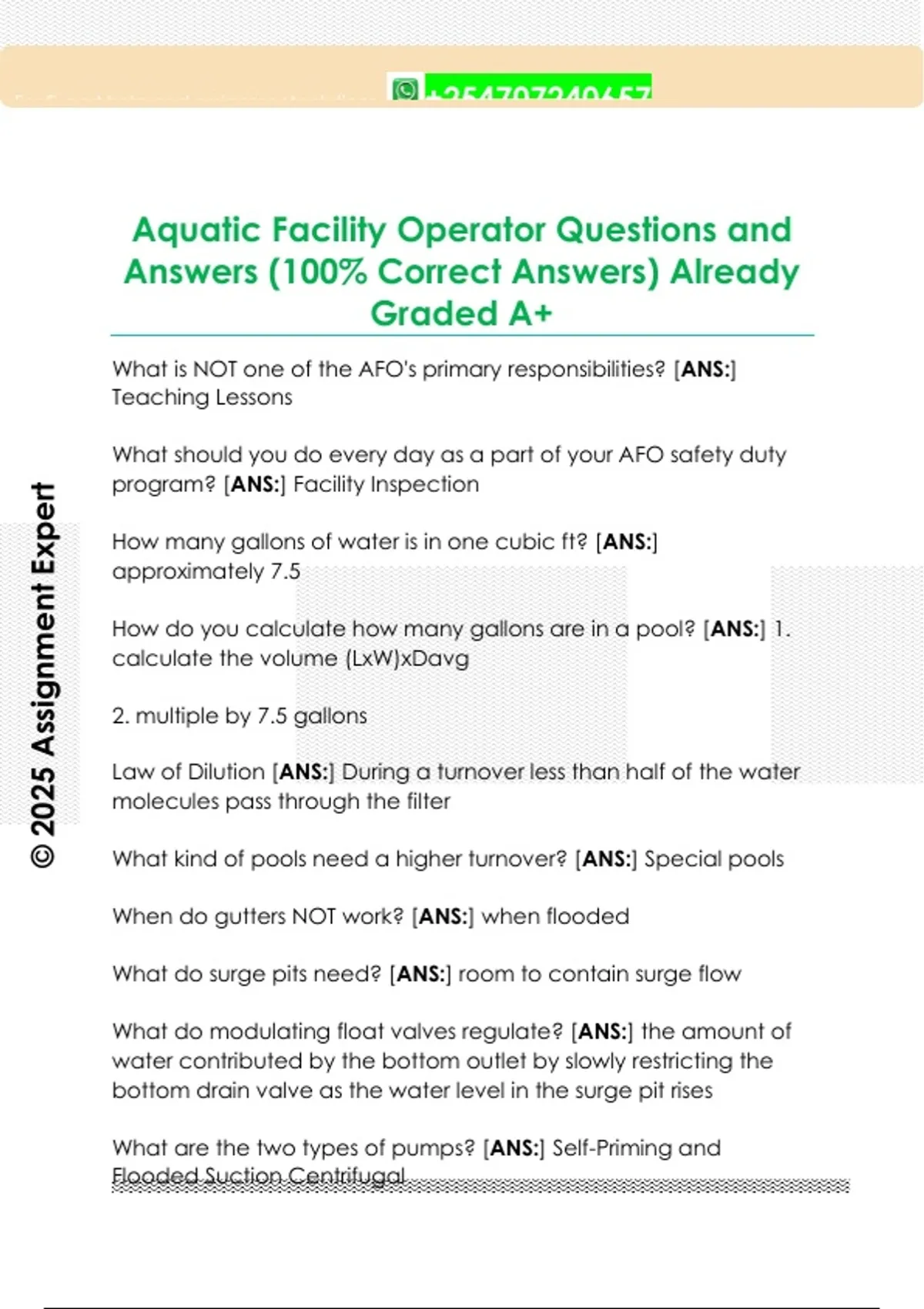 Aquatic Facility Operator Questions and Answers (100% Correct Answers) Already Graded A+