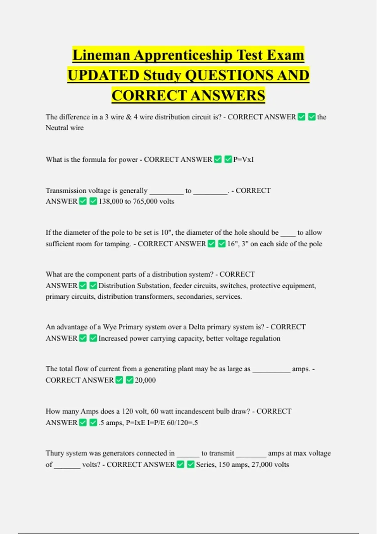 Lineman Apprenticeship Test Exam UPDATED Study QUESTIONS AND CORRECT ANSWERS The difference in a 3 wire & 4 wire distribution circuit is? - CORRECT ANSWER Neutral wire What is the formula for power - CORRECT ANSWER P=VxI Transmission voltage is generally _________ to _________. - CORRECT ANSWER 138,000 to 765,000 volts the If the diameter of the pole to be set is 10", the diameter of the hole should be ____ to allow sufficient room for tamping. - CORRECT ANSWER 16", 3" on each side of the pole What are the component parts of a distribution system? - CORRECT ANSWER Distribution Substation, feeder circuits, switches, protective equipment, primary circuits, distribution transformers, secondaries, services. An advantage of a Wye Primary system over a Delta primary system is? - CORRECT ANSWER Increased power carrying capacity, better voltage regulation The total flow of current from a generating plant may be as large as __________ amps. - CORRECT ANSWER 20,000 How many Amps does a 120 volt, 60 watt incandescent bulb draw? - CORRECT ANSWER .5 amps, P=IxE I=P/E 60/120=.5
