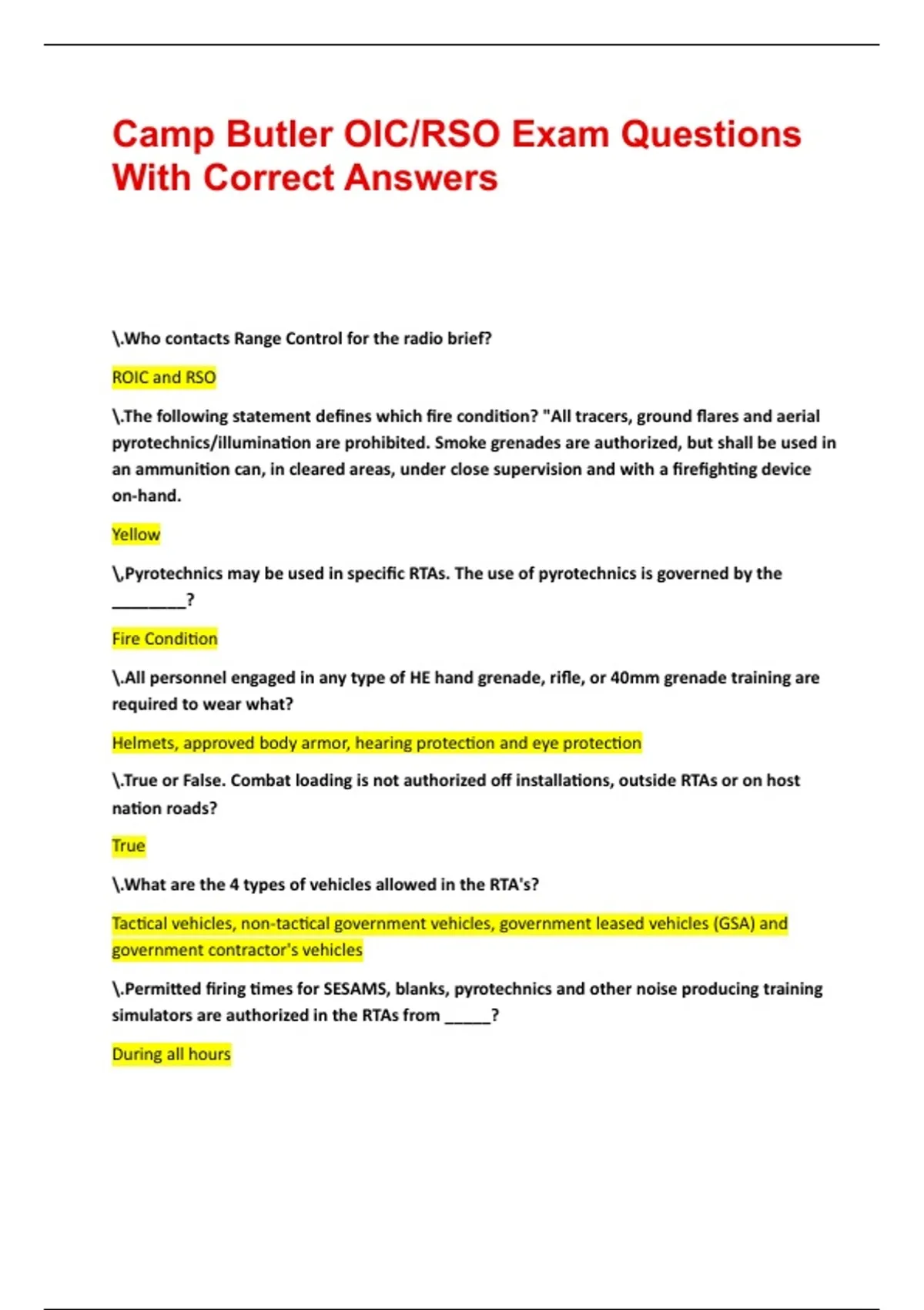 Camp Butler OIC/RSO Exam Questions With Correct Answers .Who contacts Range Control for the radio brief? ROIC and RSO .The following statement defines which fire condition? "All tracers, ground flares and aerial pyrotechnics/illumination are prohibited. Smoke grenades are authorized, but shall be used in an ammunition can, in cleared areas, under close supervision and with a firefighting device on-hand. Yellow ,Pyrotechnics may be used in specific RTAs. The use of pyrotechnics is governed by the ________? Fire Condition .All personnel engaged in any type of HE hand grenade, rifle, or 40mm grenade training are required to wear what? Helmets, approved body armor, hearing protection and eye protection .True or False. Combat loading is not authorized off installations, outside RTAs or on host nation roads? True .What are the 4 types of vehicles allowed in the RTA's? Tactical vehicles, non-tactical government vehicles, government leased vehicles (GSA) and government contractor's vehicles .Permitted firing times for SESAMS, blanks, pyrotechnics and other noise producing training simulators are authorized in the RTAs from _____? During all hours .What shall be posted to prevent entry into the danger areas that cannot be observed, or which do not lie within the established impact area? Road Guards .WSA Kushi Crossing must be scheduled a minimum lead time of __________? 48 hours .The maximum speed limit for all vehicles operating throughout the RTA's is _____ kilometers per hour, conditions permitting. During poor or inclement weather conditions this should be further reduced depending upon road conditions. 20 .Which of the following is not considered a Reportable Incident? Dead radio batteries .Units will conduct radio checks with Range Control every ________ minutes on the _______ while in a "_____" status. A "______" status is in place during all live-firing, SESAMS/UTM training, munitions' simulators, while laser systems are being used and swim/dive operations. 30 Minutes / Half Hour / Hot / Hot .What FM frequency is the Range Control Range Safety Net on? 39.65 FM .How many casualty collection points are there throughout the range training areas? The nearest casualty collection point for Range 2 is what? 13 / E .What are the three categories of MEDE-VAC / CASEVAC? Routine, priority, urgent .Which heat flag condition will Range Control cease all training within the range training areas? Administrative Black Flag .Who must have satisfactorily completed the MarineNet Range Safety Course (basic) distance learning and the MCIPAC-MCBB Range Safety Certification Program? ROIC, RSO and ARSO