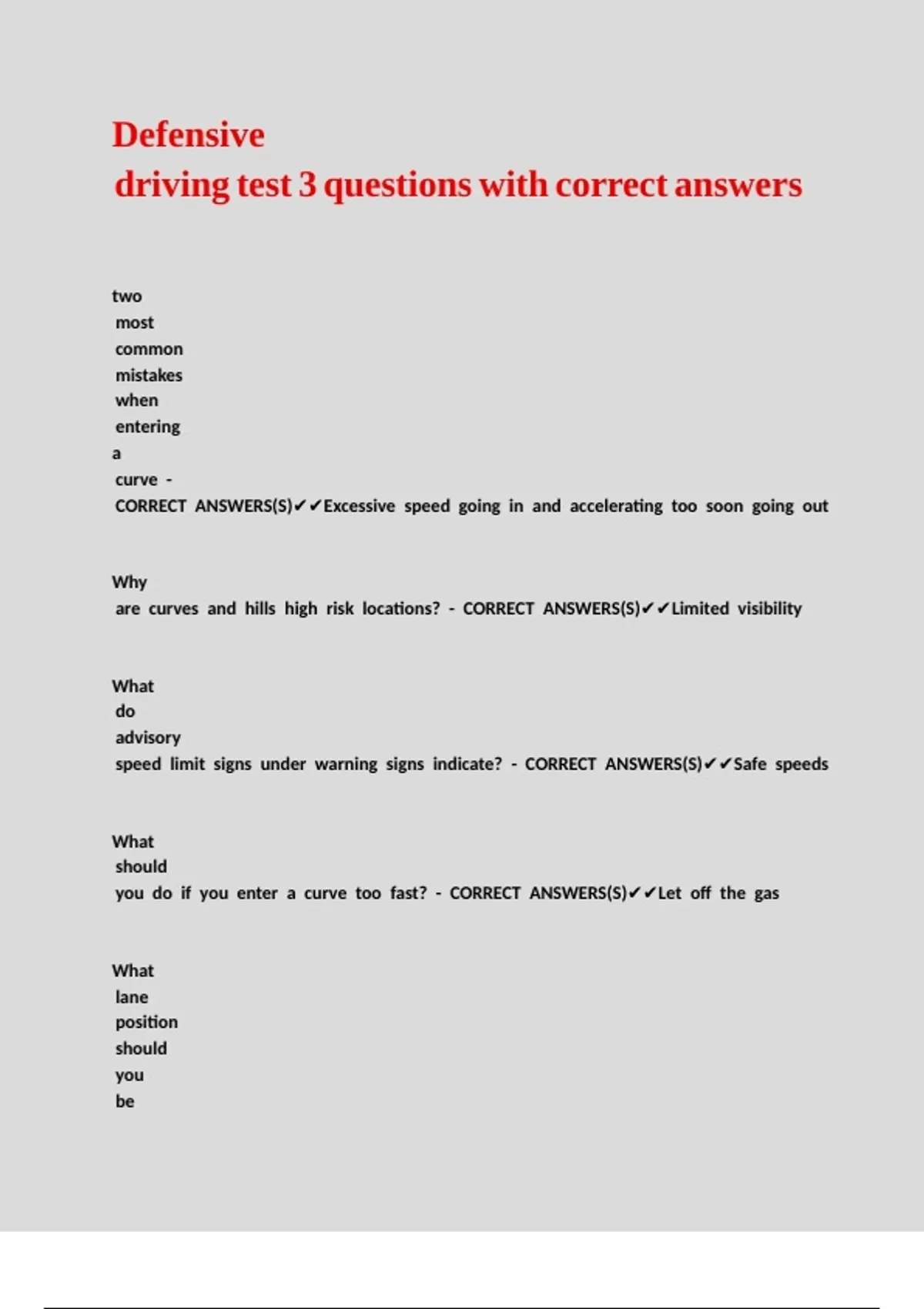 /CORRECT //ANSWERS(S)✔✔Excessive //speed //going //in //and //accelerating //too //soon //going //out