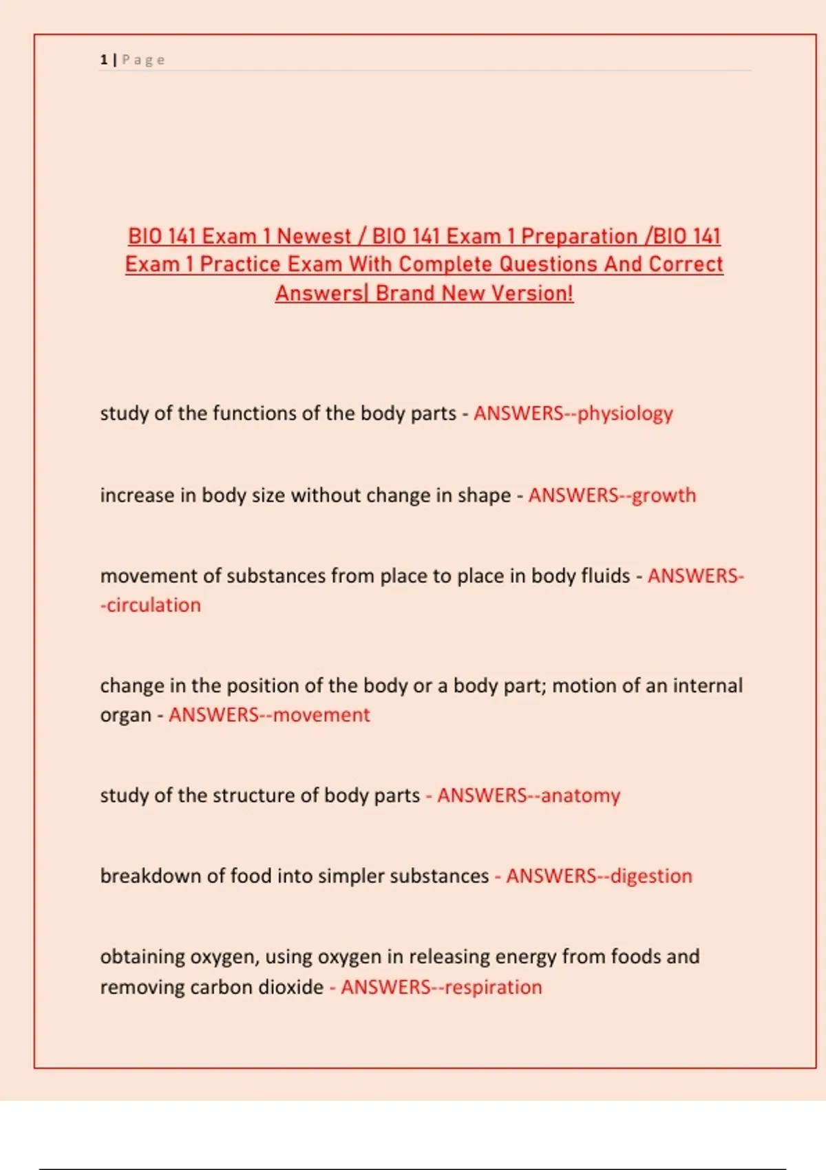 BIO 141 Exam 1 Newest / BIO 141 Exam 1 Preparation /BIO 141