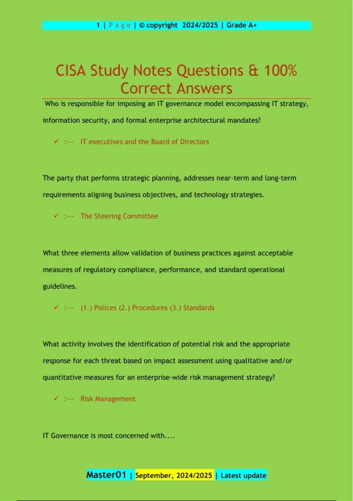 This 2025/2026 updated CISA (Certified Information Systems Auditor) study guide provides a complete collection of exam-focused questions with verified correct answers. It covers all five CISA domains, including Information System Auditing Process, IT Governance and Management, Information Systems Acquisition and Development, Information Systems Operations and Business Resilience, and Protection of Information Assets. Designed for IT auditors and professionals preparing for the CISA certification, this material ensures mastery of key concepts and full exam readiness.