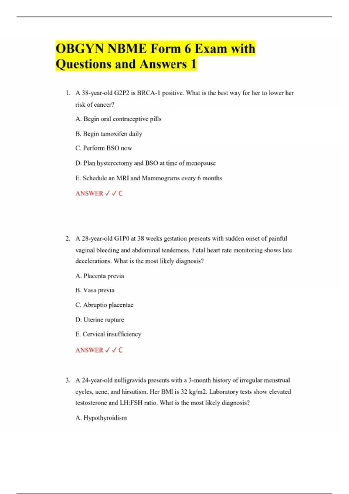 OBGYN NBME Form 6 Exam with Questions and Answers 1 1. A 38-year-old G2P2 is BRCA-1 positive. What is the best way for her to lower her risk of cancer? A. Begin oral contraceptive pills B. Begin tamoxifen daily C. Perform BSO now D. Plan hysterectomy and BSO at time of menopause E. Schedule an MRI and Mammograms every 6 months ANSWER C 2. A 28-year-old G1P0 at 38 weeks gestation presents with sudden onset of painful vaginal bleeding and abdominal tenderness. Fetal heart rate monitoring shows late decelerations. What is the most likely diagnosis? A. Placenta previa B. Vasa previa C. Abruptio placentae D. Uterine rupture E. Cervical insufficiency ANSWER C 3. A 24-year-old nulligravida presents with a 3-month history of irregular menstrual cycles, acne, and hirsutism. Her BMI is 32 kg/m2. Laboratory tests show elevated testosterone and LH:FSH ratio. What is the most likely diagnosis? A. Hypothyroidism