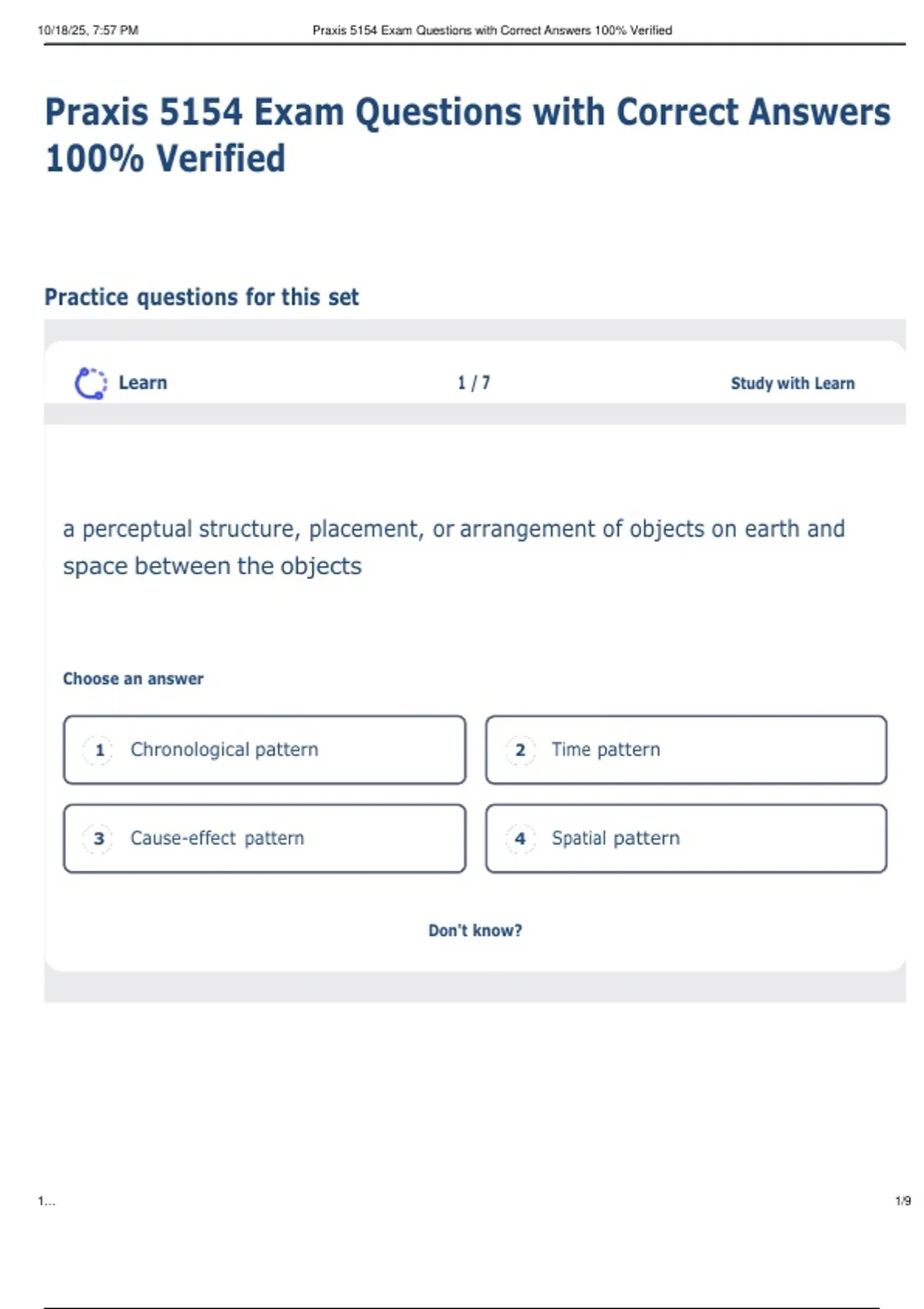 , 10/18/25, 7:57 PM Praxis 5154 Exam Questions with Correct Answers 100% Verified