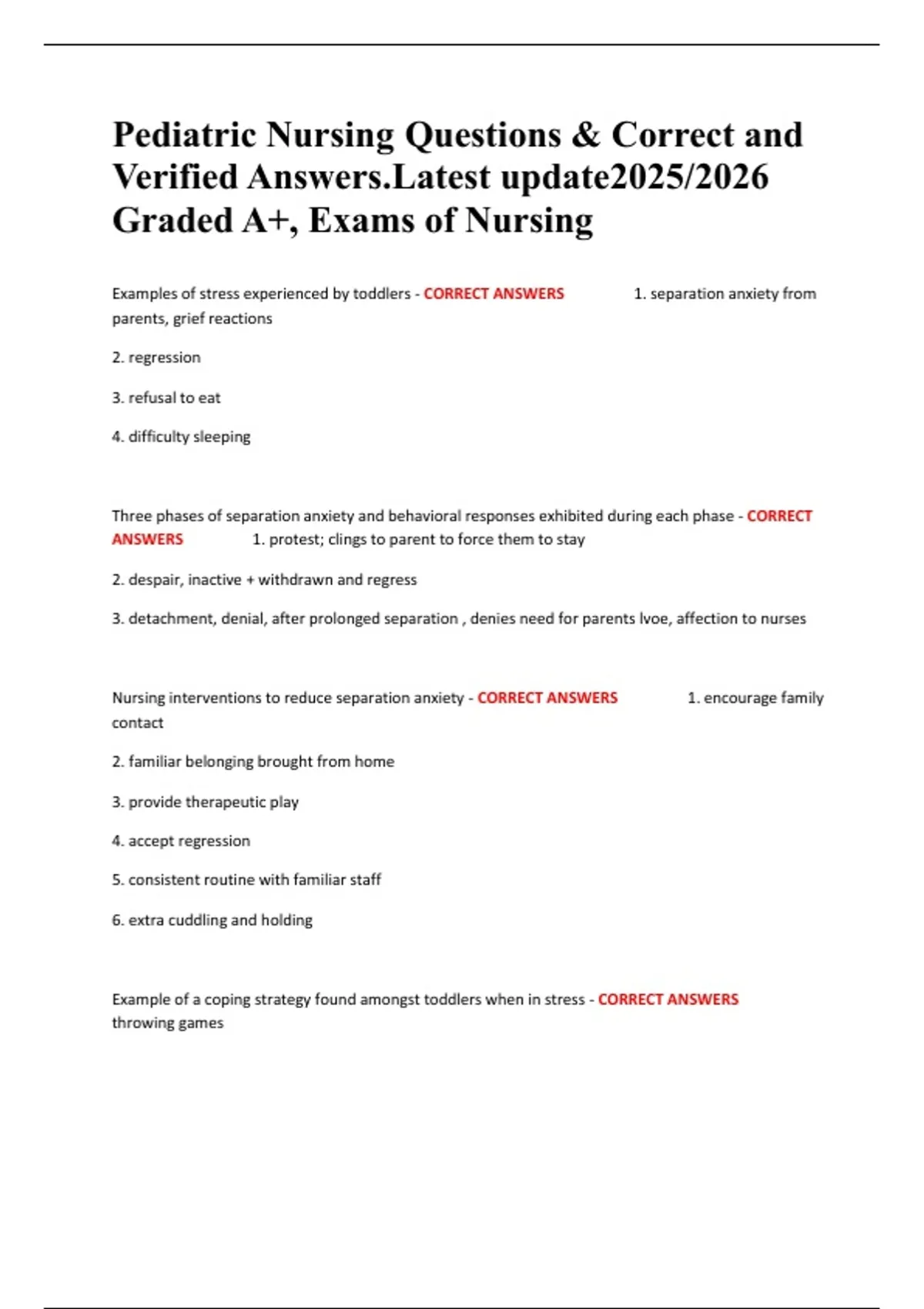 Pediatric Nursing Questions & Correct and