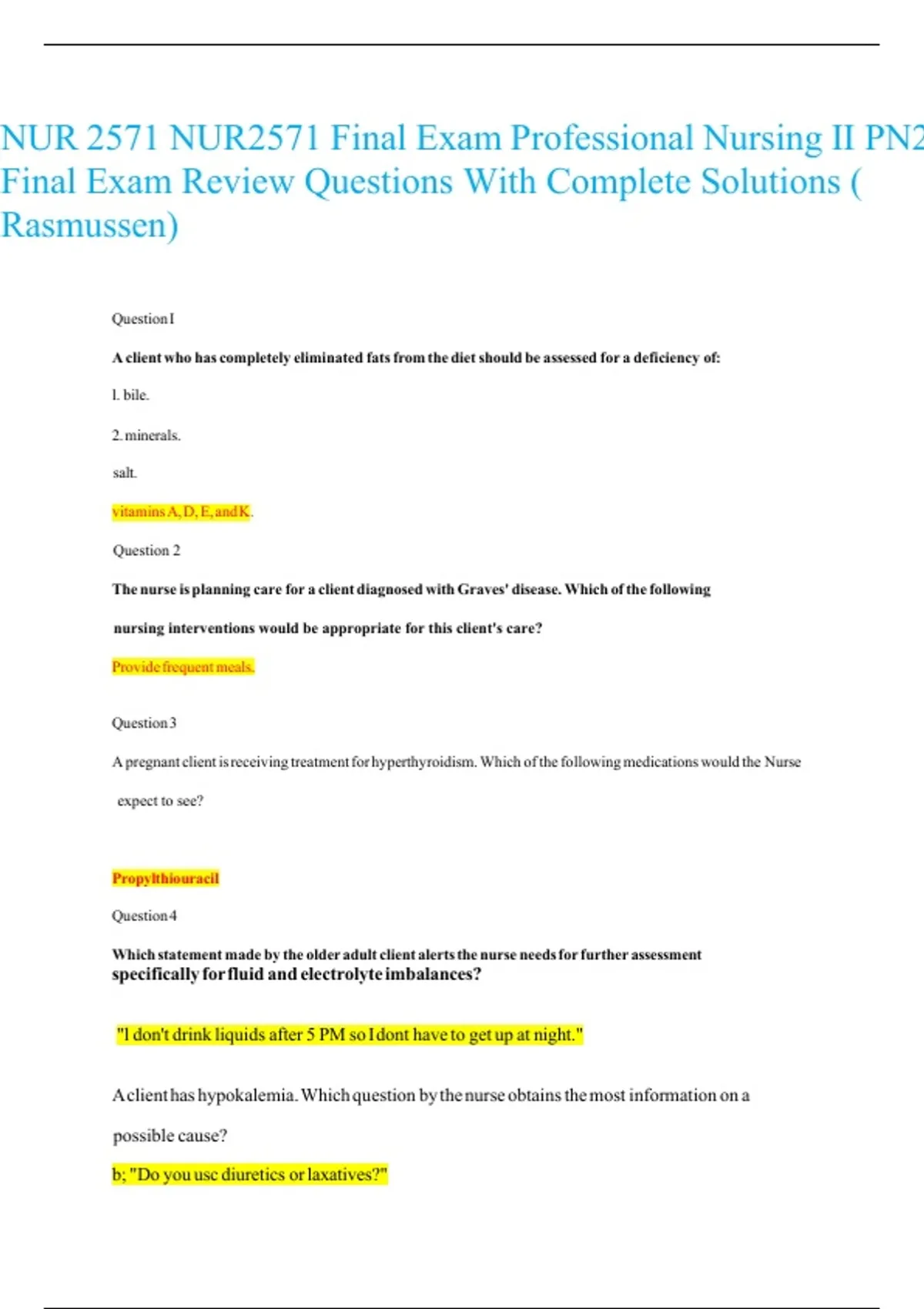 NUR 2571/NUR2571 Final Exam Professional Nursing II PN2 Final Exam Review Questions With Complete Solutions ( Rasmussen).