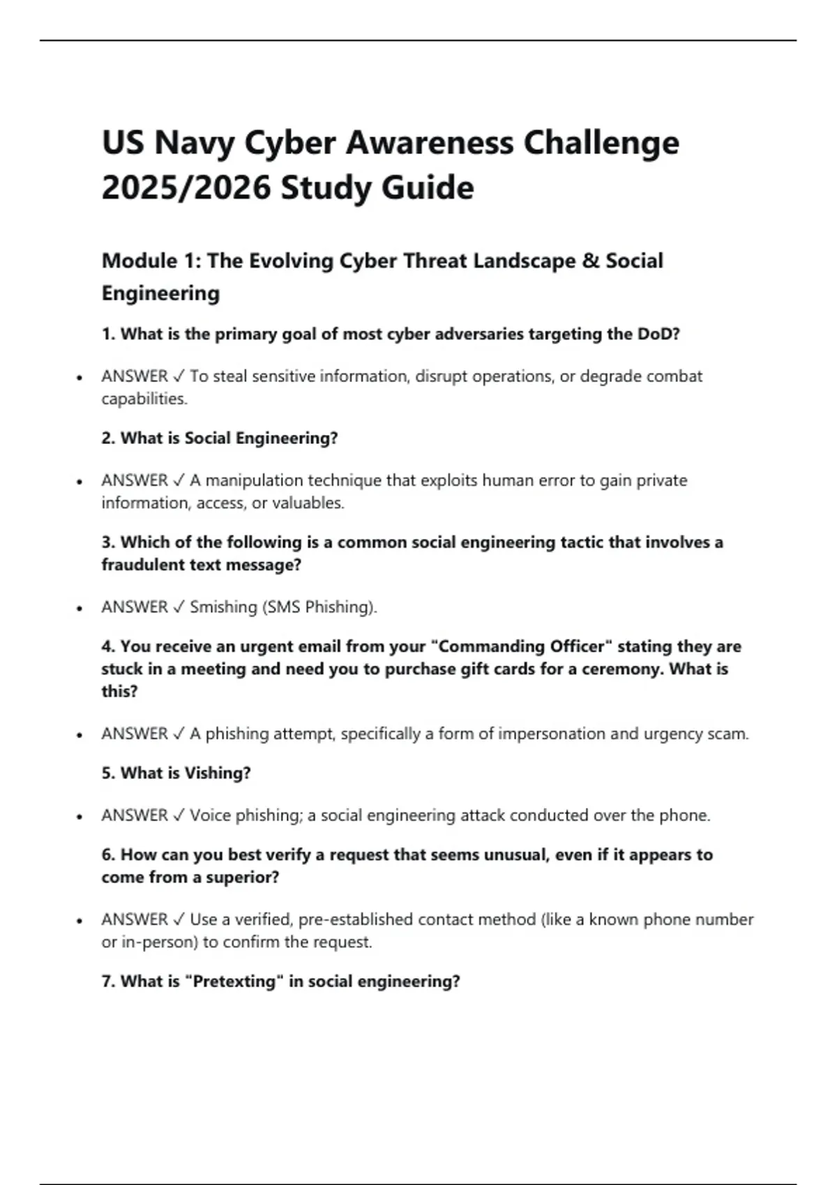 US Navy Cyber Awareness Challenge 2025/2026 Study Guide Module 1: The Evolving Cyber Threat Landscape & Social Engineering 1. What is the primary goal of most cyber adversaries targeting the DoD?  ANSWER To steal sensitive information, disrupt operations, or degrade combat capabilities. 2. What is Social Engineering?  ANSWER A manipulation technique that exploits human error to gain private information, access, or valuables. 3. Which of the following is a common social engineering tactic that involves a fraudulent text message?  ANSWER Smishing (SMS Phishing). 4. You receive an urgent email from your "Commanding Officer" stating they are stuck in a meeting and need you to purchase gift cards for a ceremony. What is this?  ANSWER A phishing attempt, specifically a form of impersonation and urgency scam. 5. What is Vishing?  ANSWER Voice phishing; a social engineering attack conducted over the phone. 6. How can you best verify a request that seems unusual, even if it appears to come from a superior?  ANSWER Use a verified, pre-established contact method (like a known phone number or in-person) to confirm the request. 7. What is "Pretexting" in social engineering?  ANSWER Creating a fabricated scenario (the pretext) to steal a victim's personal information. 8. You see a USB drive labeled "2025 Sailor Evaluations" in the parking lot. What should you do?  ANSWER Do not plug it into any computer. Immediately give it to your unit's Cybersecurity Officer. 9. What is a key indicator of a phishing email?  ANSWER Poor grammar and spelling, a sense of urgency, generic greetings, and suspicious sender addresses. 10. What should you do immediately if you click on a link in a suspicious email?  ANSWER Disconnect your device from the network (unplug Ethernet and disable WiFi/Bluetooth) and report the incident immediately. Module 2: Classified Information and Data Spillage 11. What is Data Spillage?  ANSWER The transfer of classified or sensitive information onto a non-authorized system or network. 12. What is the first thing you must do if you suspect a data spillage has occurred?  ANSWER Immediately notify your Chain of Command and your Information System Security Manager (ISSM). 13. What is the maximum period of time that classified information can be left unattended?  ANSWER Classified information must be under constant supervision by an authorized individual.