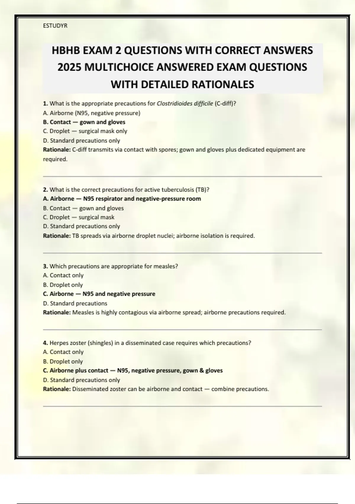 1. What is the appropriate precautions for Clostridioides difficile (C-diff)?
