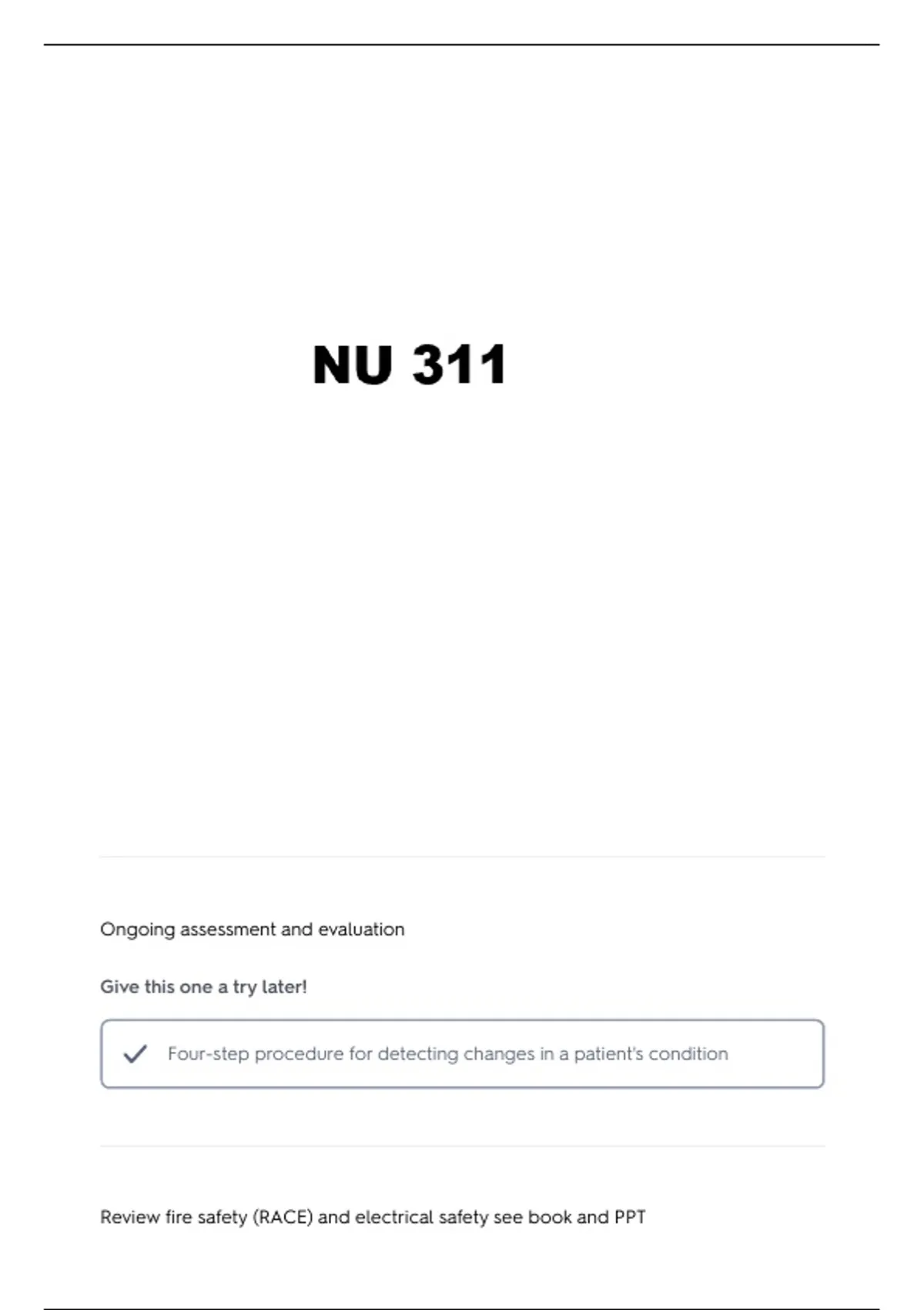 Review fire safety (RACE) and electrical safety see book and PPT