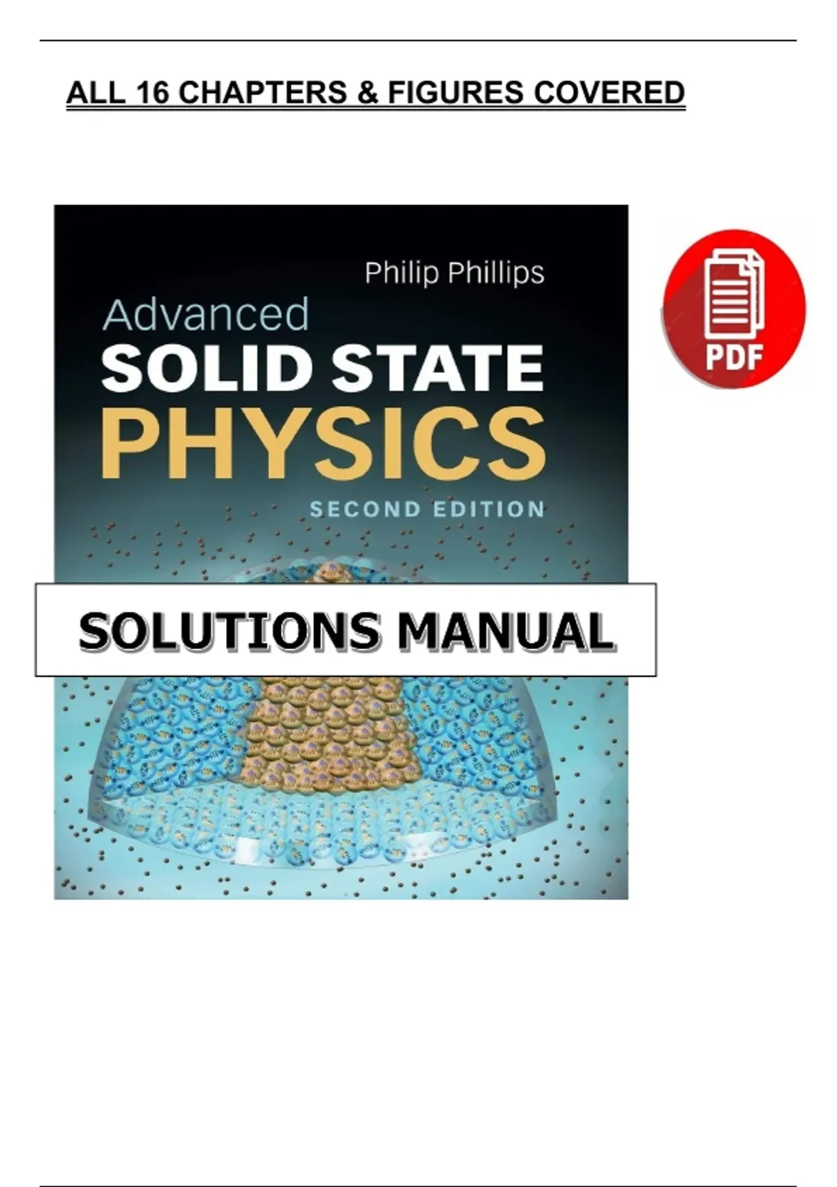 Complete solutions manual for Advanced Solid State Physics (2nd ed.) by Philip Phillips. Worked answers for 16 chapters covering tight-binding and band structure, density of states, Fermi-liquid theory and quasiparticles, Green’s functions, electron–phonon coupling and phonons, transport (Kubo), scattering and optical conductivity, magnetism, Hubbard model and Mott physics, superconductivity (BCS & beyond), disorder and Anderson localization, graphene/Dirac materials, quantum Hall and topological insulators, plus essential many-body techniques—figures included. advanced solid state physics solutions, Philip Phillips solutions manual, condensed matter solutions, tight binding band structure, density of states DOS, Fermi liquid theory, quasiparticles notes, Green’s functions many body, Hubbard model solutions, Mott insulator transition, electron phonon coupling, BCS superconductivity problems, unconventional superconductors, quantum Hall effect solutions, topological insulators slides, graphene Dirac materials, Anderson localization disorder, Kubo formula transport, optical conductivity derivation, magnetism spin order, renormalization group basics, many body physics problems