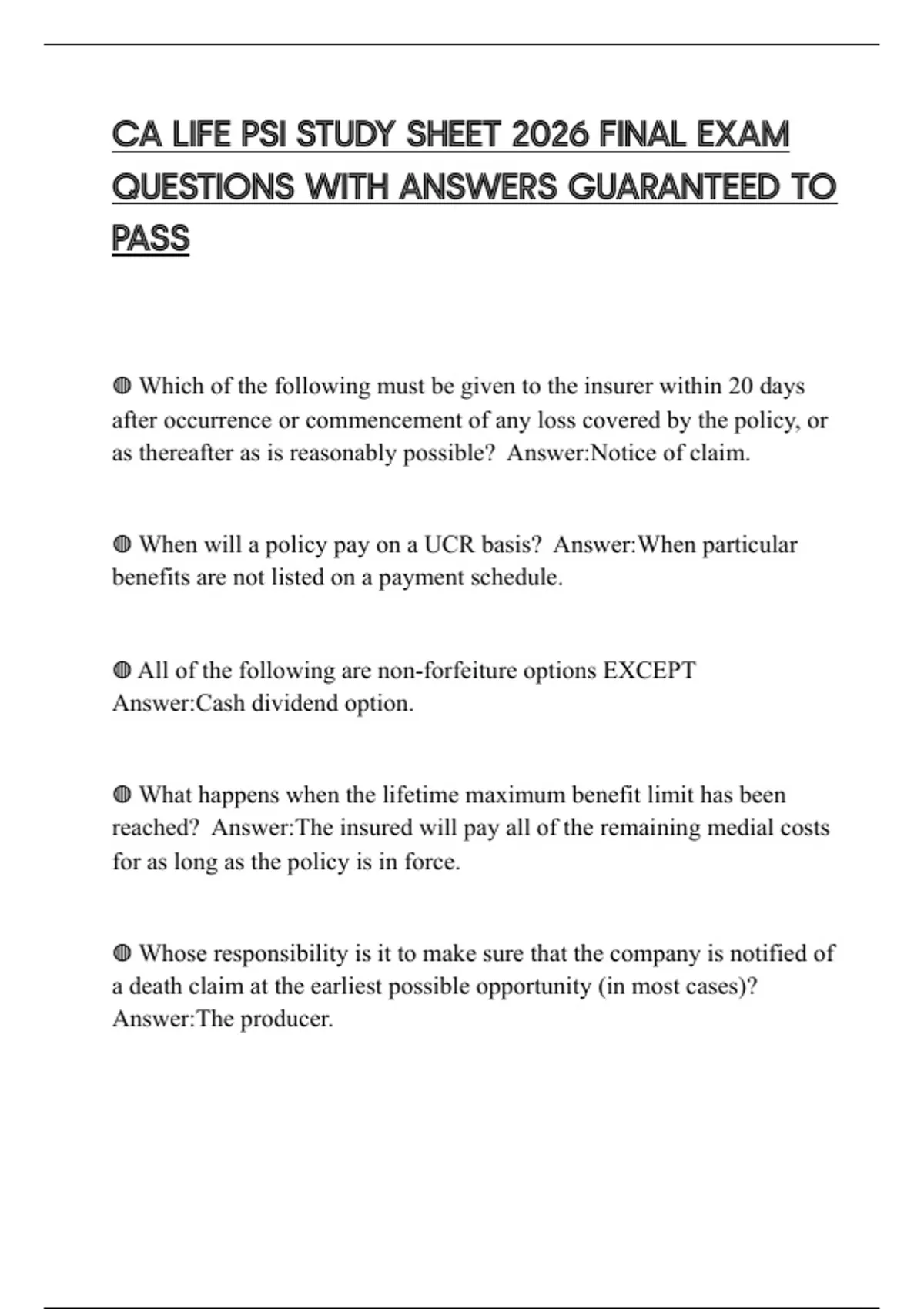 CA LIFE PSI STUDY SHEET 2026 FINAL EXAM QUESTIONS WITH ANSWERS GUARANTEED TO PASS
