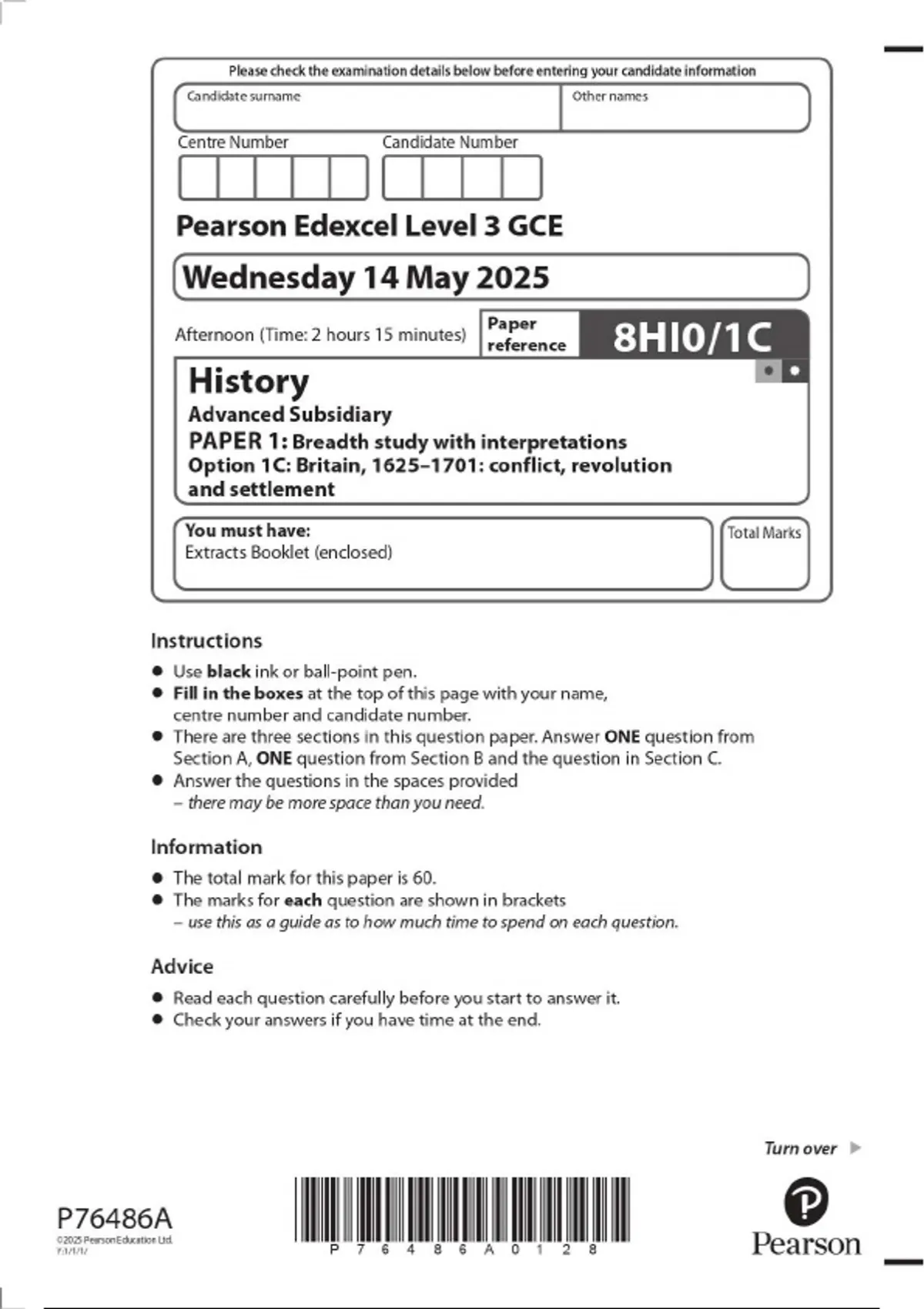 2025 Pearson Edexcel Level 3 GCE 8HI0/1C History Advanced Subsidiary PAPER 1: Breadth study with interpretations Option 1C: Britain, 1625– 1701: conflict, revolution and settlement