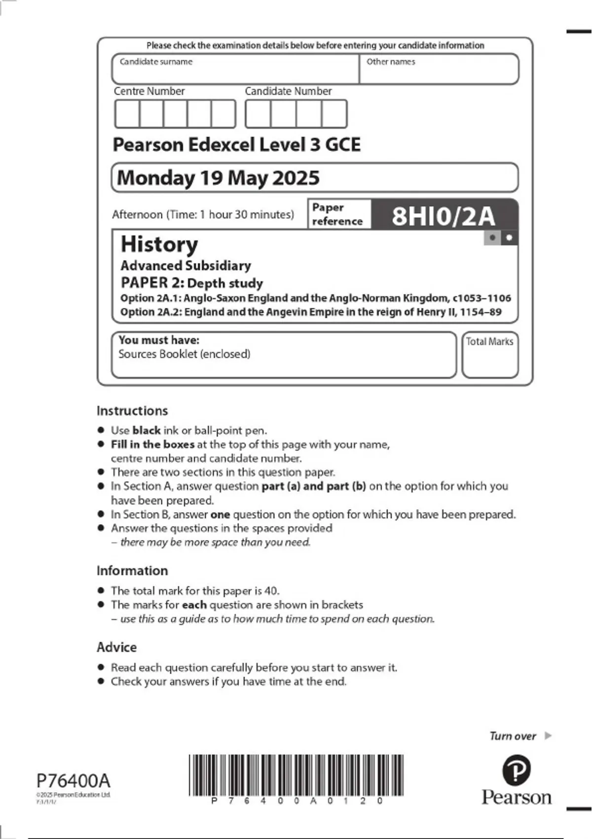 2025 Pearson Edexcel Level 3 GCE 8HI0/2A History Advanced Subsidiary PAPER 2: Depth study Option 2A.1: Anglo-Saxon England and the Anglo-Norman Kingdom, c1053–1106 Option 2A.2: England and the Angevin Empire in the reign of Henry II, 1154–89