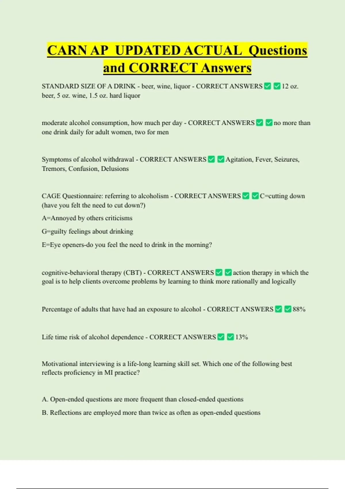 CAGE Questionnaire: referring to alcoholism - CORRECT ANSWERS C=cutting down
