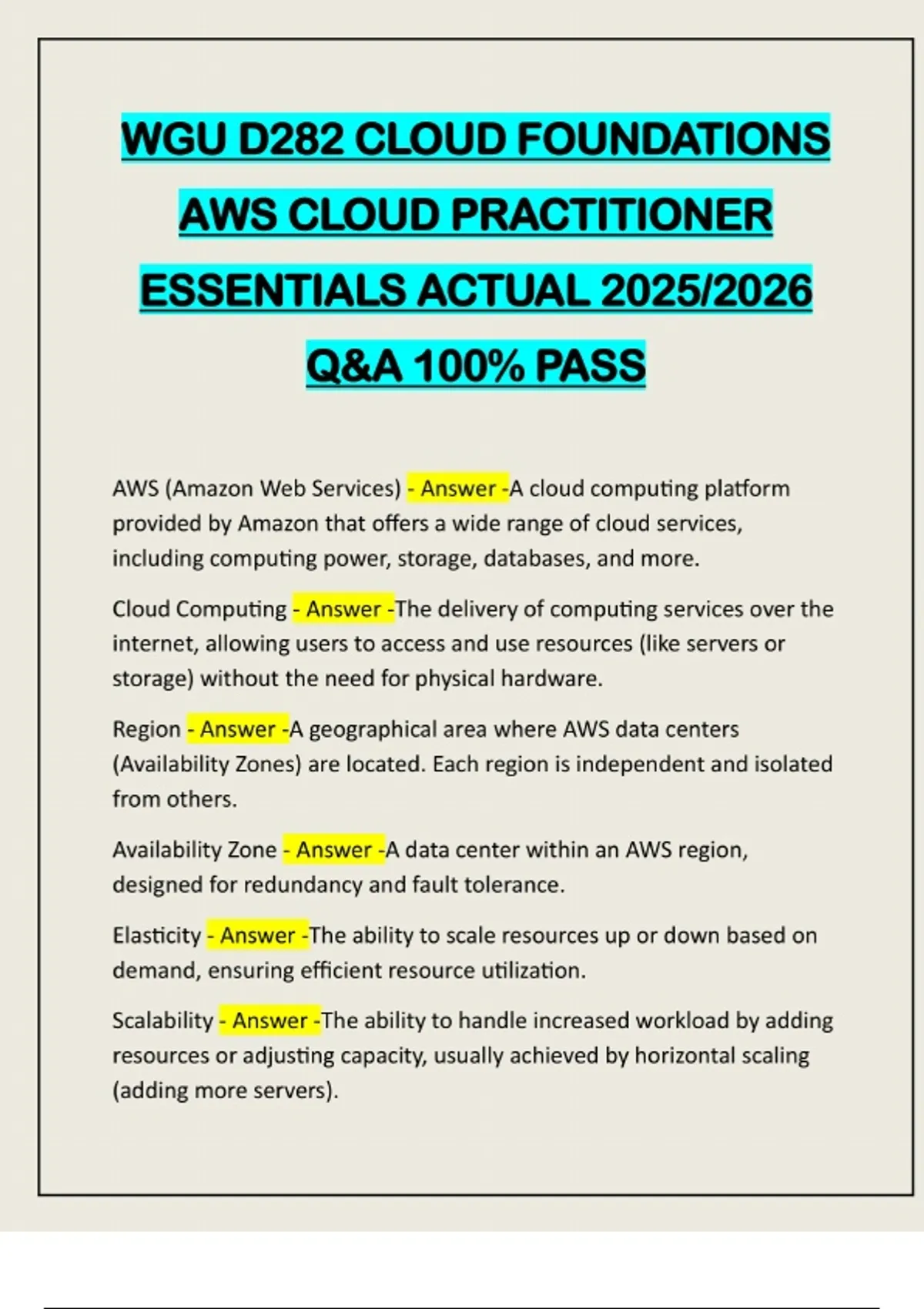 WGU D282 CLOUD FOUNDATIONS AWS CLOUD PRACTITIONER ESSENTIALS ACTUAL 2025/2026 Q&A 100% PASS AWS (Amazon Web Services) - Answer -A cloud computing platform provided by Amazon that offers a wide range of cloud services, including computing power, storage, databases, and more. Cloud Computing - Answer -The delivery of computing services over the internet, allowing users to access and use resources (like servers or storage) without the need for physical hardware. Region - Answer -A geographical area where AWS data centers (Availability Zones) are located. Each region is independent and isolated from others. Availability Zone - Answer -A data center within an AWS region, designed for redundancy and fault tolerance. Elasticity - Answer -The ability to scale resources up or down based on demand, ensuring efficient resource utilization. Scalability - Answer -The ability to handle increased workload by adding resources or adjusting capacity, usually achieved by horizontal scaling (adding more servers).EC2 (Elastic Compute Cloud) - Answer -AWS's virtual server service, allowing users to create and manage virtual machines. S3 (Simple Storage Service) - Answer -AWS's object storage service for storing and retrieving data, often used for backup, data archiving, and content distribution. RDS (Relational Database Service) - Answer -AWS's managed database service, which simplifies the setup, operation, and scaling of relational databases. IAM (Identity and Access Management) - Answer -A service that allows you to control access to AWS resources by creating and managing users, groups, and permissions. VPC (Virtual Private Cloud) - Answer -A logically isolated section of the AWS cloud where you can launch AWS resources, including instances, databases, and more. Load Balancer - Answer -A service that evenly distributes incoming network traffic across multiple instances, ensuring high availability and fault tolerance. EBS (Elastic Block Store) - Answer -AWS's block storage service used to create and attach storage volumes to EC2 instances. Lambda - Answer -A serverless compute service that allows you to run code in response to events without provisioning or managing servers. SaaS (Software as a Service) - Answer -A cloud computing model where software applications are hosted and provided as a service over the internet.PaaS (Platform as a Service) - Answer -A cloud computing model where a platform and environment for developing, running, and managing applications is provided. IaaS (Infrastructure as a Service) - Answer -A cloud computing model where virtualized computing resources (like servers and storage) are provided as a service over the internet. TCO (Total Cost of Ownership) - Answer -The total cost associated with owning and operating an IT infrastructure, including hardware, software, maintenance, and more. Compliance - Answer -Adherence to regulatory requirements and industry standards for data security and privacy. Billing and Cost Management - Answer -Monitoring and controlling costs associated with AWS resources and services. High Availability - Answer -A design approach that ensures systems or applications are accessible and operational with minimal downtime. Fault Tolerance - Answer -The ability of a system to continue functioning even in the presence of hardware or software failures. Backup - Answer -Creating copies of data to protect against data loss, typically stored in a separate location or medium. Snapshot - Answer -A point-in-time copy of data, often used for backup and recovery purposes, especially in AWS EBS volumes. Security Group - Answer -A virtual firewall for controlling inbound and outbound traffic to AWS resources, such as EC2 instances.