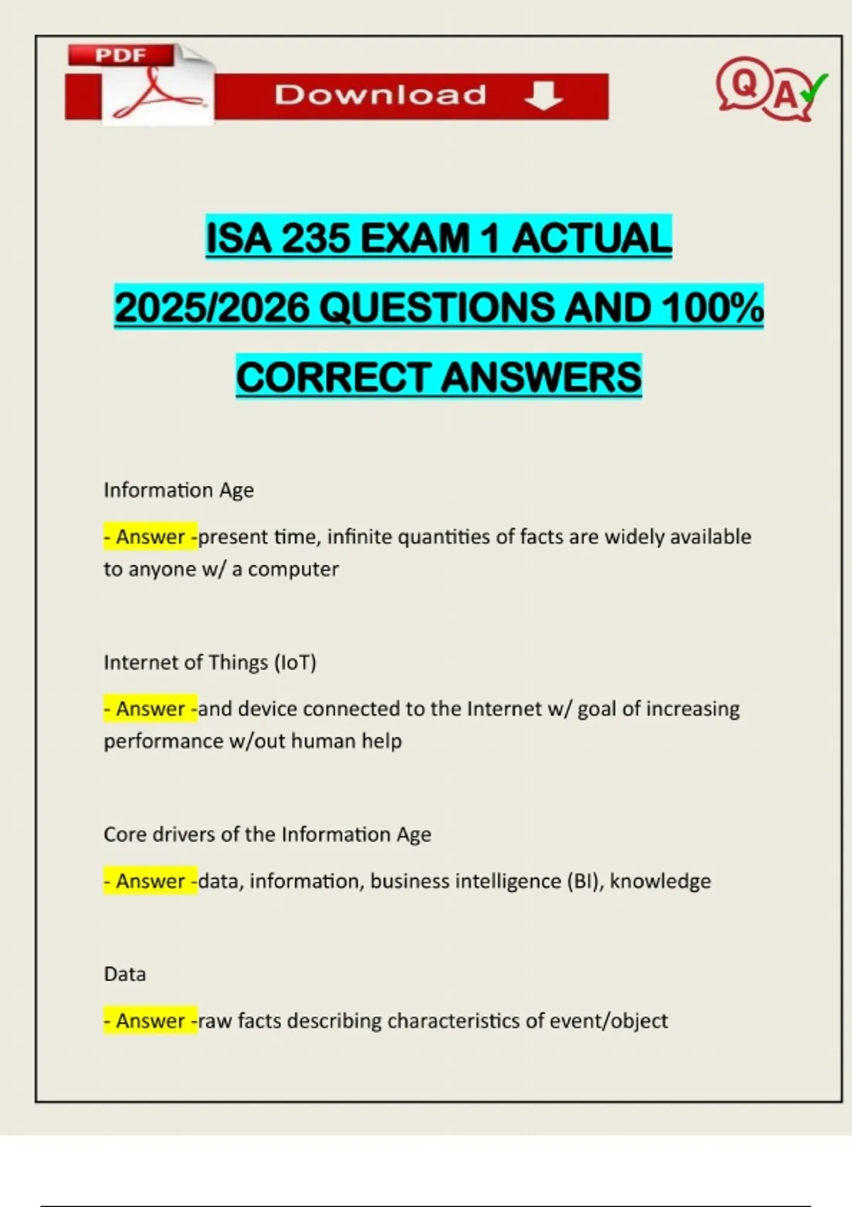 ISA 235 EXAM 1 ACTUAL 2025/2026 QUESTIONS AND 100% CORRECT ANSWERS Information Age - Answer -present time, infinite quantities of facts are widely available to anyone w/ a computer Internet of Things (IoT) - Answer -and device connected to the Internet w/ goal of increasing performance w/out human help Core drivers of the Information Age - Answer -data, information, business intelligence (BI), knowledge Data - Answer -raw facts describing characteristics of event/objectNeed assistance on Online classes, Exams & Assignments? Reach out for instant help!! Full Course Assistance, Plagiarism-free Essay Writing, Research Paper, Dissertation, Discussion Posts, etc…. Confidential & Secure services. Tutors are available for all subjects! Email now at: fact = confirmation/validation of event/object can be structured or unstructured big data - Answer -large volumes of data with increased variety, veracity, velocity veracity = uncertainty/untrustworthiness of data can be structured or unstructured information - Answer -data converted into meaningful context report = data organized into table/matrix