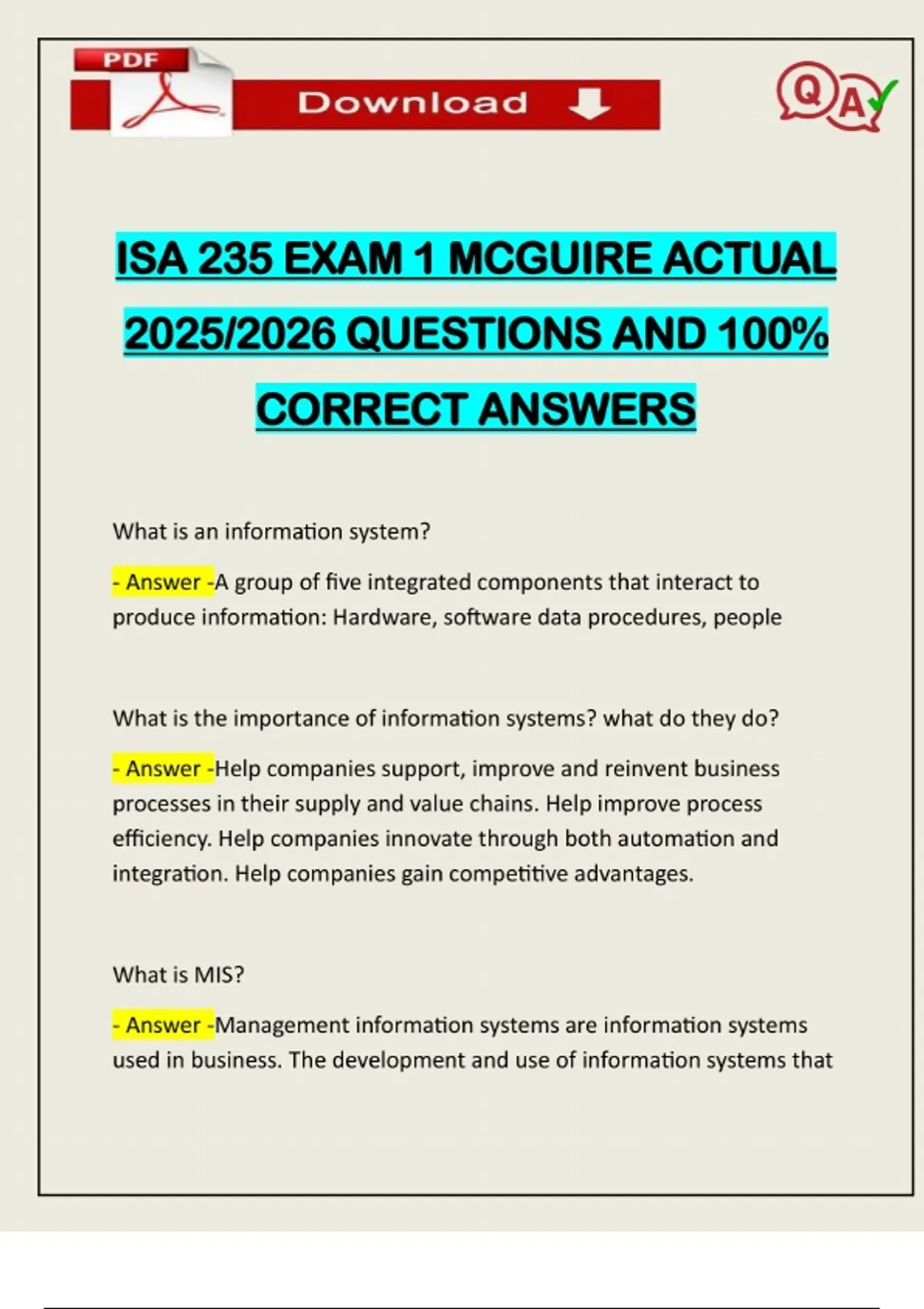 ISA 235 EXAM 1 MCGUIRE ACTUAL 2025/2026 QUESTIONS AND 100% CORRECT ANSWERS What is an information system? - Answer -A group of five integrated components that interact to produce information: Hardware, software data procedures, people What is the importance of information systems? what do they do? - Answer -Help companies support, improve and reinvent business processes in their supply and value chains. Help improve process efficiency. Help companies innovate through both automation and integration. Help companies gain competitive advantages. What is MIS? - Answer -Management information systems are information systems used in business. The development and use of information systems thatNeed assistance on Online classes, Exams & Assignments? Reach out for instant help!! Full Course Assistance, Plagiarism-free Essay Writing, Research Paper, Dissertation, Discussion Posts, etc…. Confidential & Secure services. Tutors are available for all subjects! Email now at: help achieve their strategies. also a field of study on how to accomplish this. difference between information technology and information systems - Answer -information technology refers to the methods, inventions, standards, and products and is not a system. Information systems is a system that is IT plus people and procedures/processes that makes IT useful. You can buy IT, but not IS.