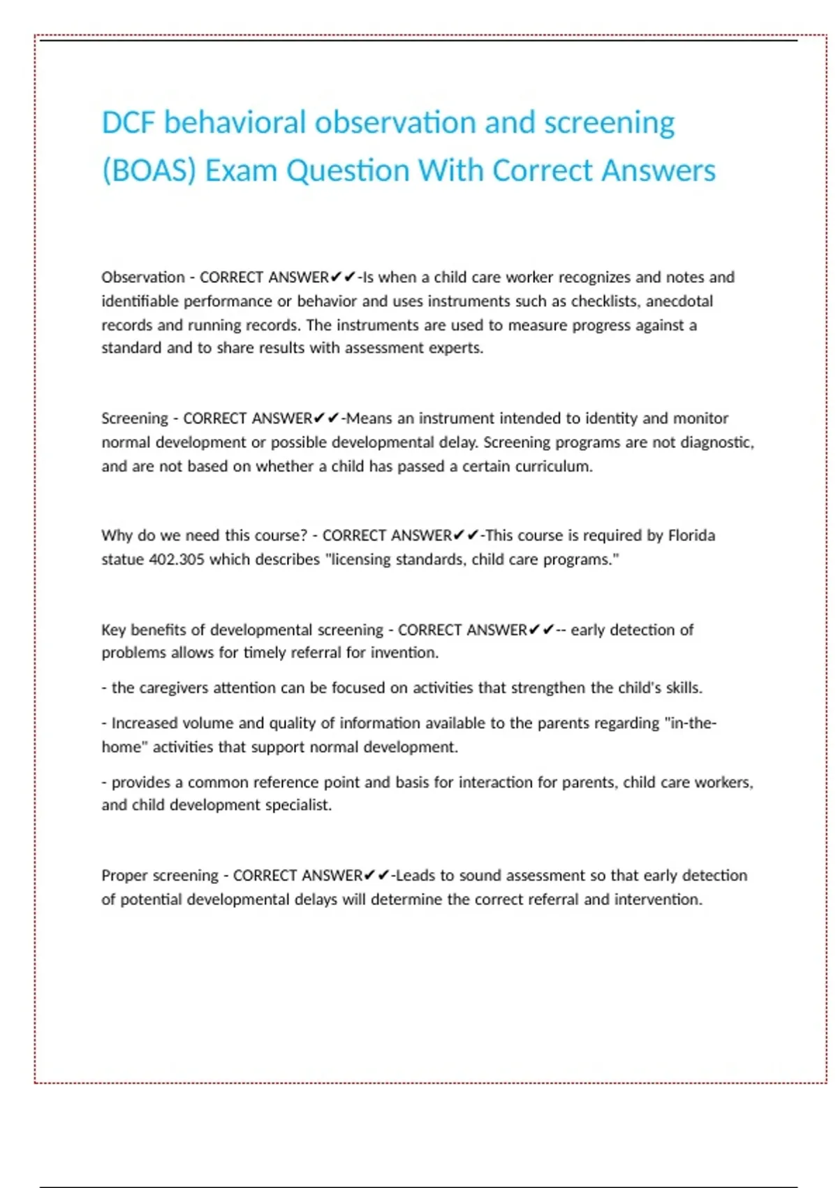 DCF behavioral observation and screening (BOAS) Exam Question With Correct Answers