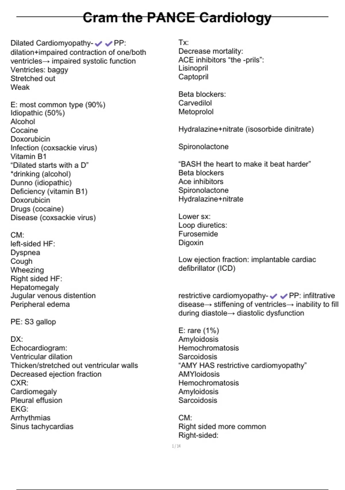Dilated Cardiomyopathy- PP: dilation+impaired contraction of one/both ventricles→ impaired systolic function Ventricles: baggy Stretched out Weak E: most common type (90%) Idiopathic (50%) Alcohol Cocaine Doxorubicin Infection (coxsackie virus) Vitamin