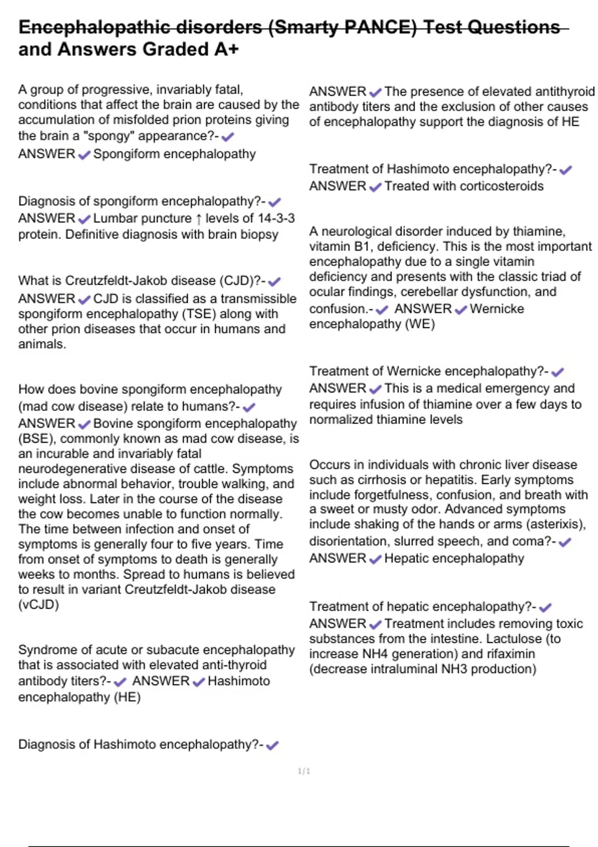 Encephalopathic disorders (Smarty PANCE) Test Questions and Answers Graded A+