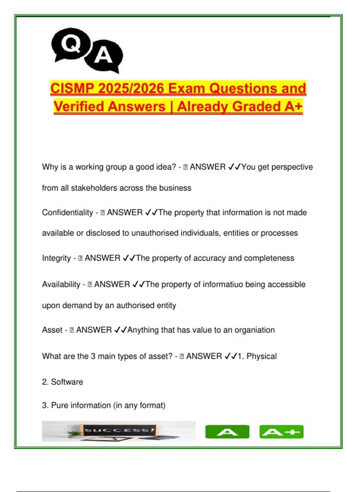 This document is a fully curated and graded A+ resource for students preparing for the Certificate in Information Security Management Principles (CISMP) for the 2025/2026 exam cycle, aligned with the British Computer Society (BCS) certification. It includes over 300 exam-style questions and model answers, covering all major CISMP syllabus domains. Topics range from information security principles, risk management, threat/vulnerability analysis, cryptography, disaster recovery, legal frameworks (e.g., GDPR, Computer Misuse Act), security controls, cloud computing, to incident management and business continuity planning. Ideal for learners in cybersecurity, information assurance, and IT governance courses, this guide is especially useful for: Undergraduate or postgraduate students in Computer Science, Information Systems, or Cybersecurity programs Working professionals pursuing BCS/CISMP certification Candidates preparing for ISO/IEC 27001, GRC, or risk and compliance-related exams Students from institutions such as University of London, Open University, or any school offering security-focused IT training The Q&A format ensures high retention, while real-world terminology and standards prepare users for both the exam and professional application. This document is structured for maximum clarity, making it ideal for revision, group study, or crash prep before assessment. Keywords: CISMP, information security, BCS certification, risk management, access control, cryptography, business continuity, GDPR, cybersecurity exam, information assurance, ISO 27001, disaster recovery, threat analysis, security controls, network security, cloud computing, penetration testing, SIEM, forensic readiness
