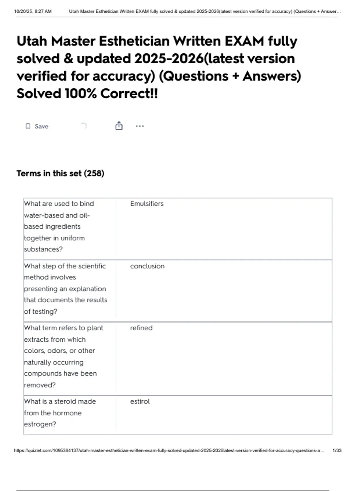 https://quizlet.com/1095384137/utah-master-esthetician-written-exam-fully-solved-updated-2025-2026latest-version-verified-for-accuracy-questions-a… 1/33