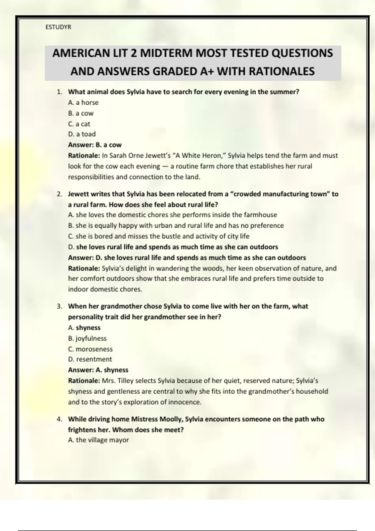 AMERICAN LIT 2 MIDTERM MOST TESTED QUESTIONS AND ANSWERS GRADED A+ WITH RATIONALES