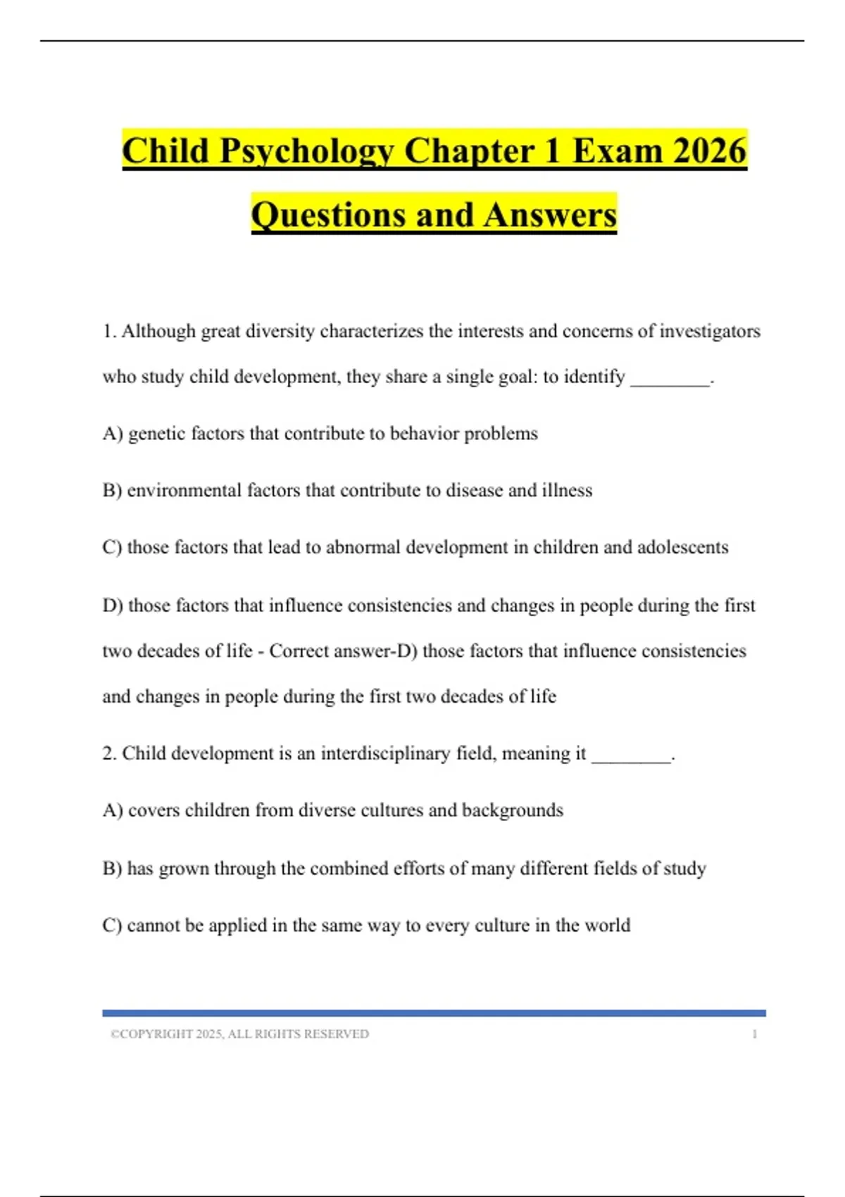 Child Psychology Chapter 1 Exam 2026 Questions and Answers