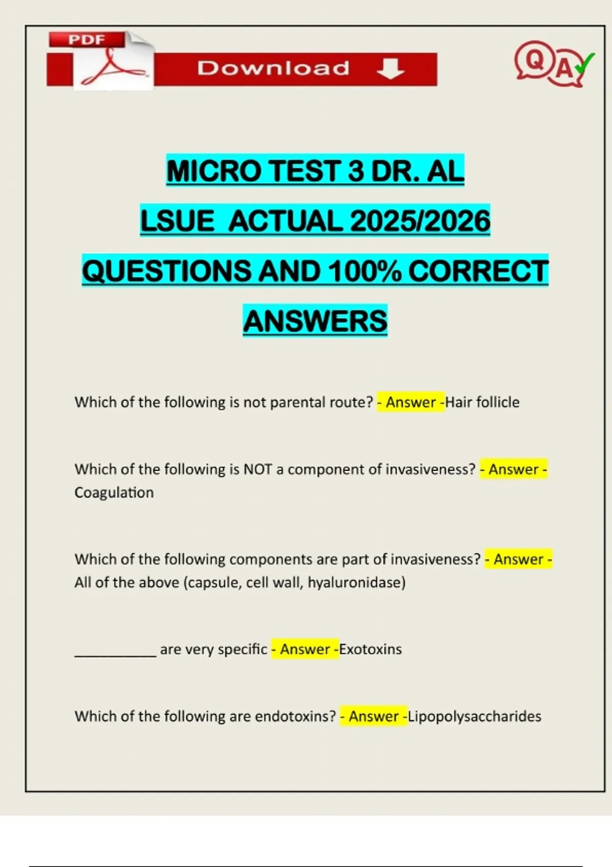 MICRO TEST 3 DR. AL LSUE ACTUAL 2025/2026 QUESTIONS AND 100% CORRECT ANSWERS Which of the following is not parental route? - Answer -Hair follicle Which of the following is NOT a component of invasiveness? - Answer - Coagulation Which of the following components are part of invasiveness? - Answer - All of the above (capsule, cell wall, hyaluronidase) __________ are very specific - Answer -Exotoxins Which of the following are endotoxins? - Answer -LipopolysaccharidesNeed assistance on Online classes, Exams & Assignments? Reach out for instant help!! Full Course Assistance, Plagiarism-free Essay Writing, Research Paper, Dissertation, Discussion Posts, etc…. Confidential & Secure services. Tutors are available for all subjects! Email now at: What is the rate of Microbial death - Answer -They are killed at a constant rate What is an E Test? - Answer -a manual in vitro diagnostic device used by laboratories to determine the MIC (answer will say something about the strips used in the device) What is the most effective form of ch