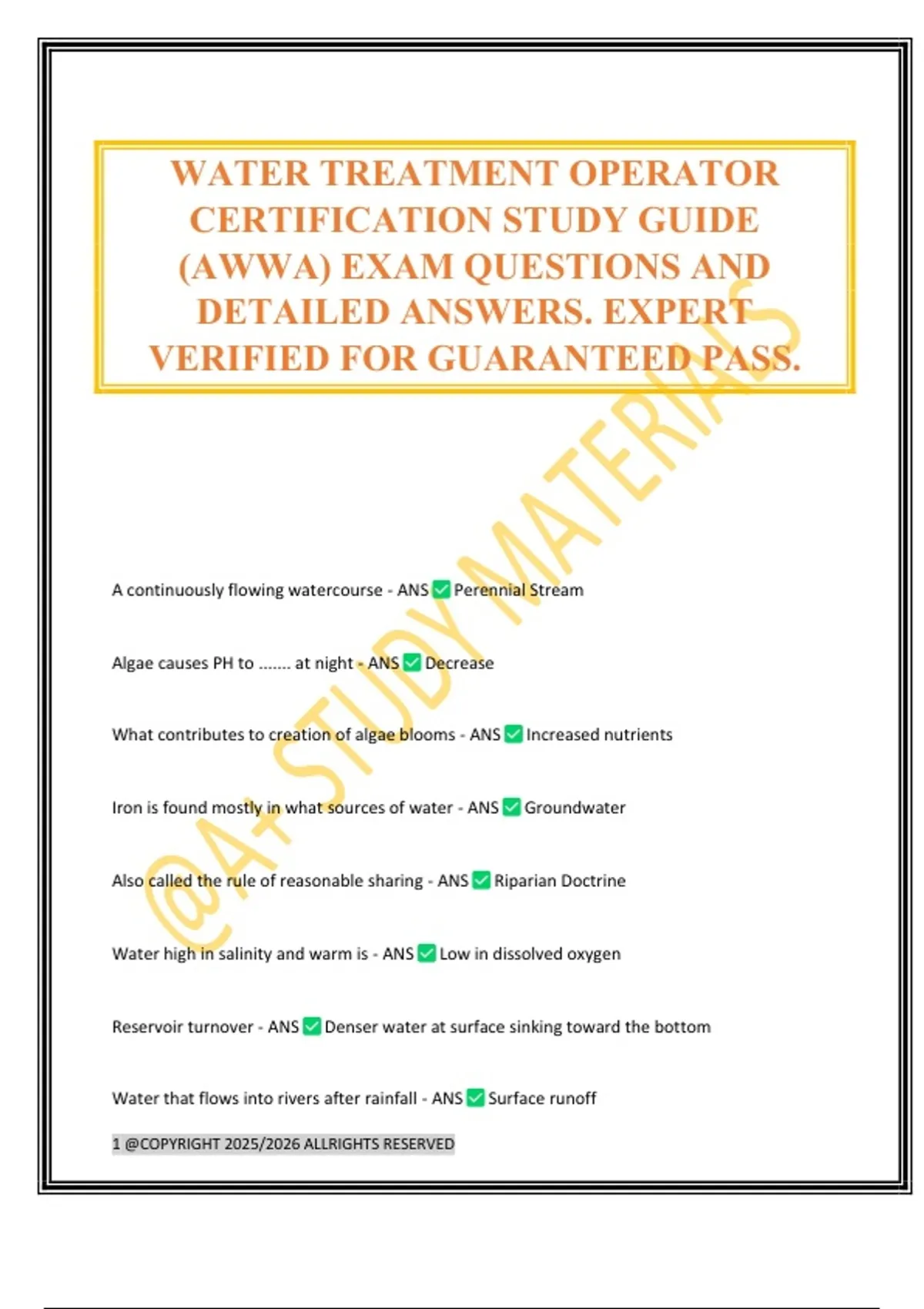 WATER TREATMENT OPERATOR CERTIFICATION STUDY GUIDE (AWWA) EXAM QUESTIONS AND DETAILED ANSWERS. EXPERT VERIFIED FOR GUARANTEED PASS.