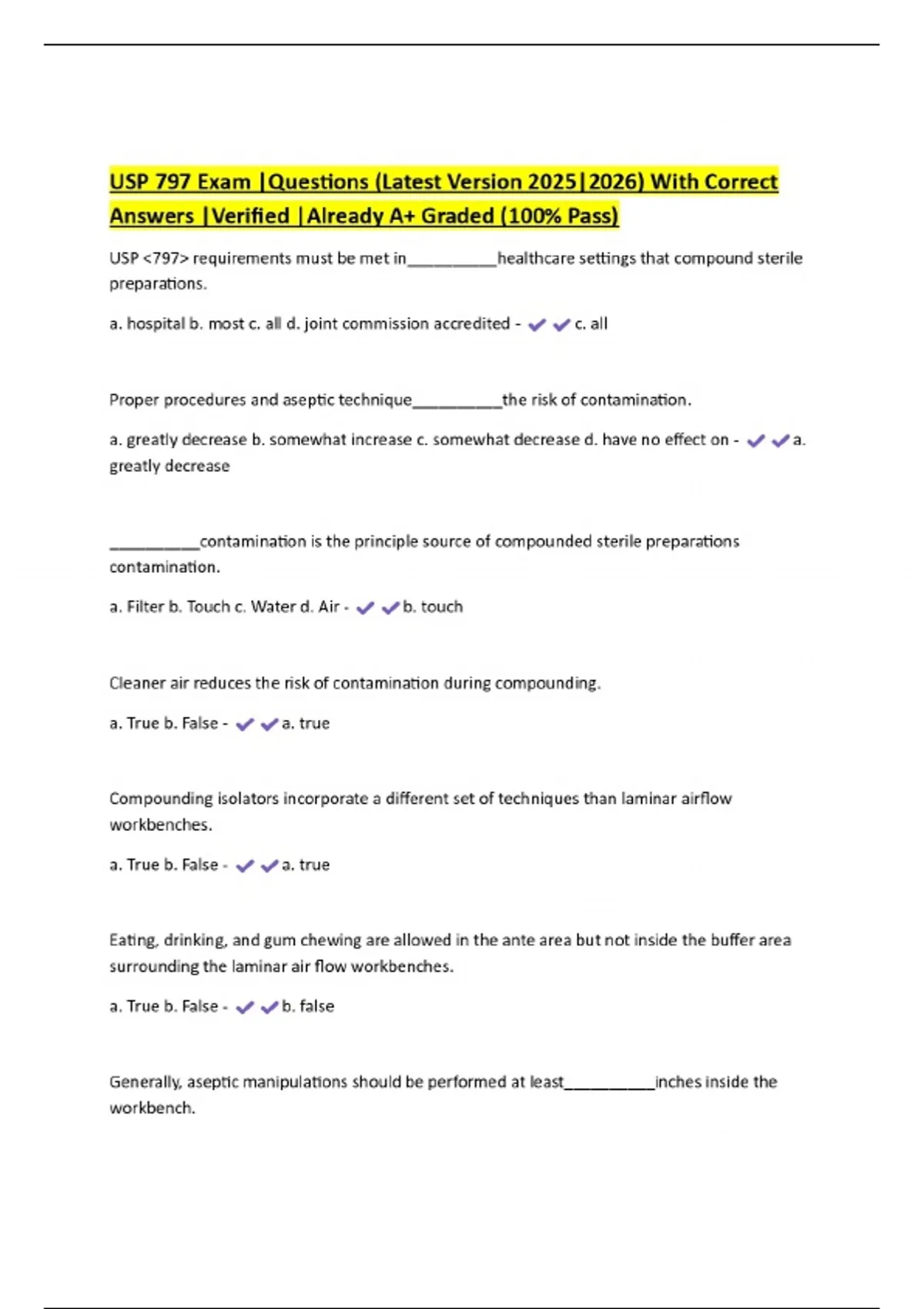 USP 797 Exam |Questions (Latest Version 2025|2026) With Correct Answers |Verified |Already A+ Graded (100% Pass)