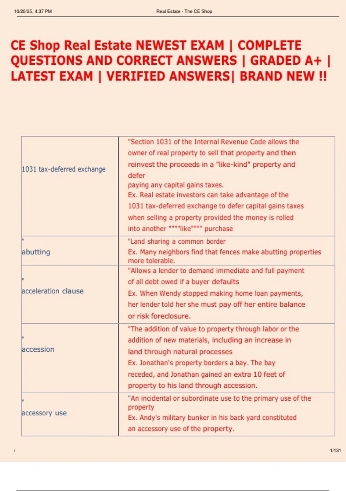 CE Shop Real Estate NEWEST EXAM | COMPLETE QUESTIONS AND CORRECT ANSWERS | GRADED A+ | LATEST EXAM | VERIFIED ANSWERS| BRAND NEW !! 1031 tax-deferred exchange "Section 1031 of the Internal Revenue Code allows the owner of real property to sell that property and then reinvest the proceeds in a "like-kind" property and defer paying any capital gains taxes. Ex. Real estate investors can take advantage of the 1031 tax-deferred exchange to defer capital gains taxes when selling a property provided the money is rolled into another """"like"""" purchase " abutting "Land sharing a common border Ex. Many neighbors find that fences make abutting properties more tolerable. " acceleration clause "Allows a lender to demand immediate and full payment of all debt owed if a buyer defaults Ex. When Wendy stopped making home loan payments, her lender told her she must pay off her entire balance or risk foreclosure. " accession "The addition of value to property through labor or the addition of new materials, including an increase in land through natural processes Ex. Jonathan's property borders a bay. The bay receded, and Jonathan gained an extra 10 feet of property to his land through accession. " accessory use "An incidental or subordinate use to the primary use of the property Ex. Andy's military bunker in his back yard constituted an accessory use of the property. 10/20/25, 4:37 PM Real Estate - The CE Shop / 2/131 " accounting "One of the fiduciary duties, accounting means an agent is accountable for any funds or properties entrusted to the agent. This is a duty that survives termination of an agency agreement. Ex. Cameron accepted an earnest money deposit from his buyer. His duty of accounting means that he must safeguard the funds and handle them according to the agreement with his client and the policies of his firm. " accretion "Land build up over water by sand, silt, or gravel Ex. Jillian's property grew through accretion when a landslide wiped out an adjacent creek. " accrued items "Expenses that are accruing but are not yet payable (e.g., property taxes) Ex. At closing, accrued items must be accounted for on the settlement statement. If the seller has accrued expenses not yet payable, the amount accrued will be a seller debit and buyer credit. " acknowledgment "A requirement for deed transfer; a public official must acknowledge the grantor's signature Ex. Gary purchased a duplex. The grantor signed the deed; a notary public acknowledged his signature. " acre "43,560 square feet Ex. The Jones farmhouse was on 10 acres. Their parcel had 435,600 square feet. 10/20/25, 4:37 PM Real Estate - The CE Shop / 3/131 " active fraud "Intentional misstatement of a material fact Ex. ""Sure, the foundation is perfectly safe!"" Lisa said, even though she knew full well that there was a crack the size if Toledo in it. " act of waste "Abuse of a property by a person who holds possession through a life estate Ex. When Minerva inherited the historic mansion and turned it into an illegal video gaming parlor, this was an act of waste that caused her to lose title to the property. " actual notice "Express notice given directly to a person Ex. Karen told her neighbors she would be moving; this was actual notice. " addendum "An addition to a real estate contract that's added before contract acceptance Ex. Steve decided to ask for the washer and dryer after all, so he asked his broker to write up an addendum to the sales contract. " adjustable rate mortgage (ARM) "A mortgage with a rate that adjusts based on changes in a market index Ex. Caleb had a 5/1 ARM. His loan had a fixed interest rate for the first five years, and after 5 years, it could change annually depending changes to the market index. " adjusted basis "The final basis for taxing purposes computed by taking acquisition costs plus capital improvements and subtracting depreciation taken Ex. When Mark computed the adjusted basis in his property, he had to subtract $10,000 in depreciation he had taken over the years. " adjustment "The dollar value or percentage added to or subtracted from the sales price of a comparable to arrive at an indicated value for the subject Ex. Whether the adjustment is made for a "good" or a "bad" feature, it is made to the comparable, not to the subject. " adjustment date "The date on which the interest rate changes on an adjustable rate mortgage. Ex. Karey made sure to refinance before her adjustment rate. Rates had dropped and she could get a better