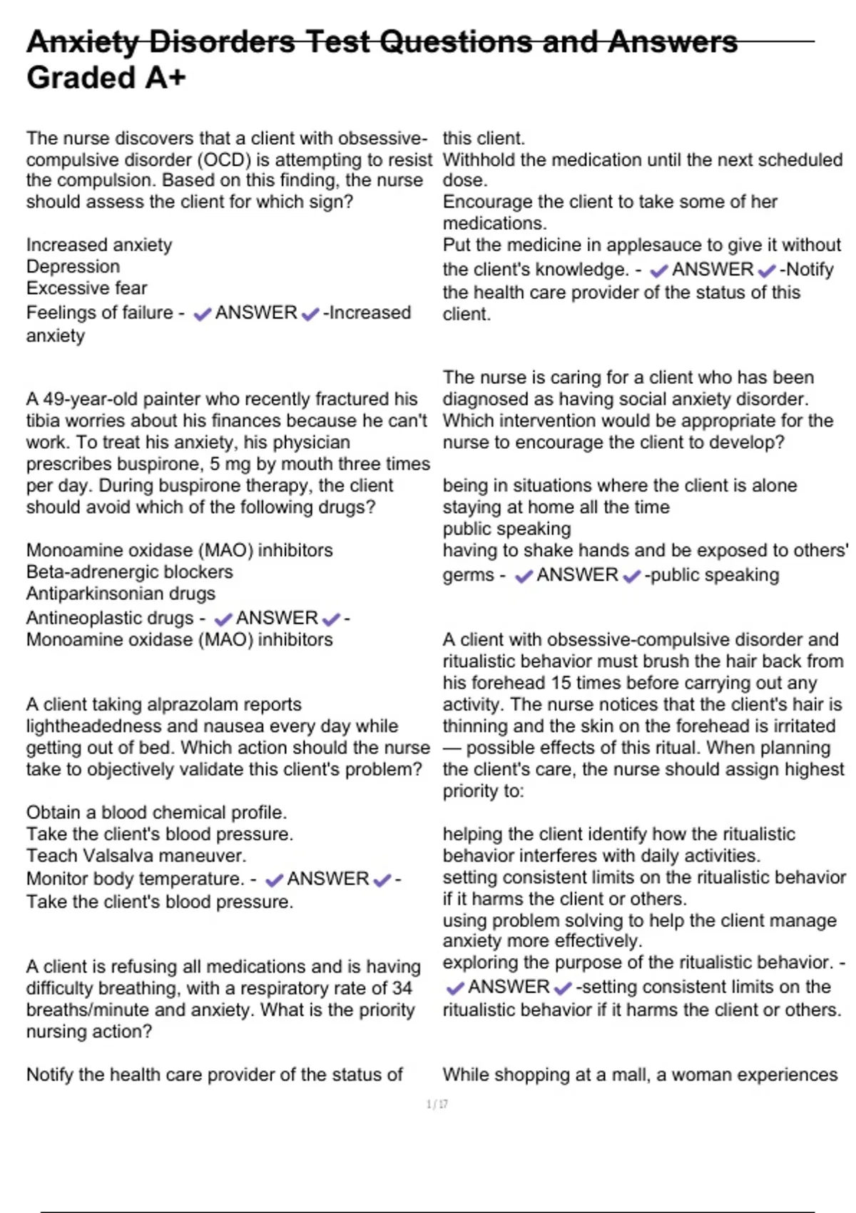 Anxiety Disorders Test Questions and Answers Graded A+