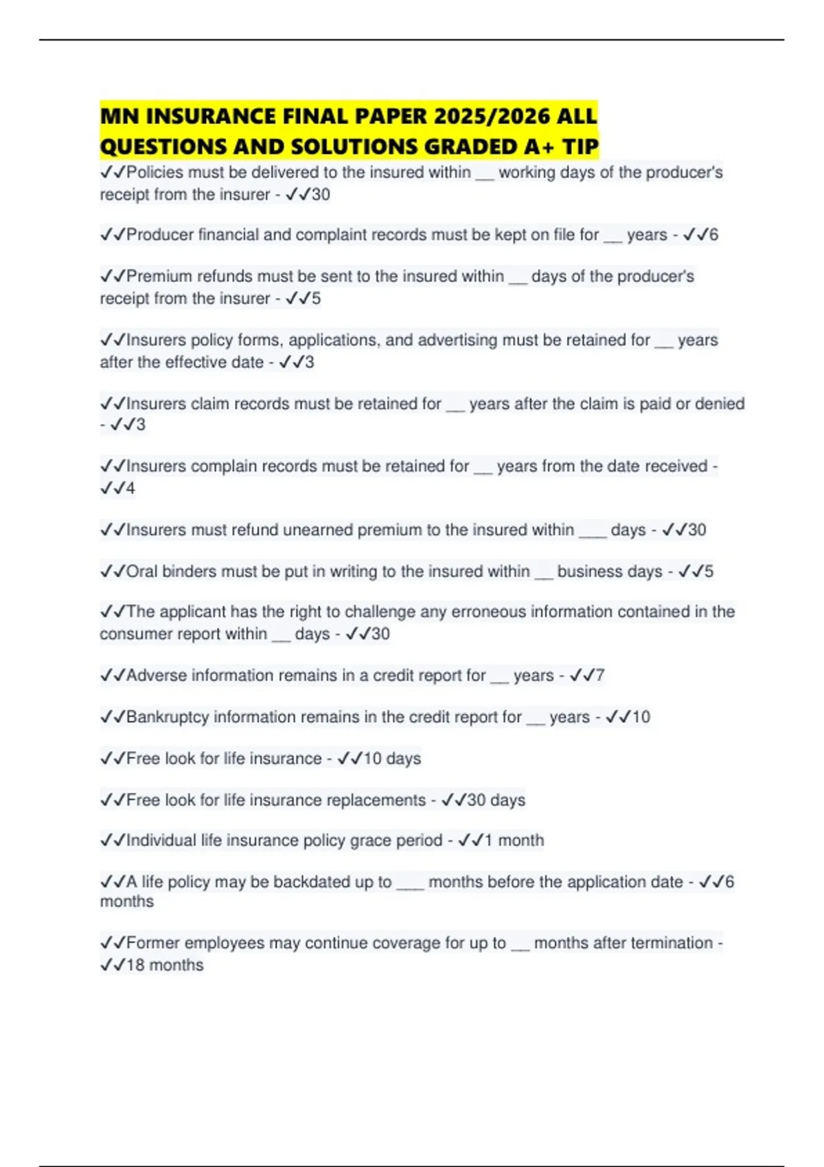 MN INSURANCE FINAL PAPER 2025/2026 ALL QUESTIONS AND SOLUTIONS GRADED A+ TIP