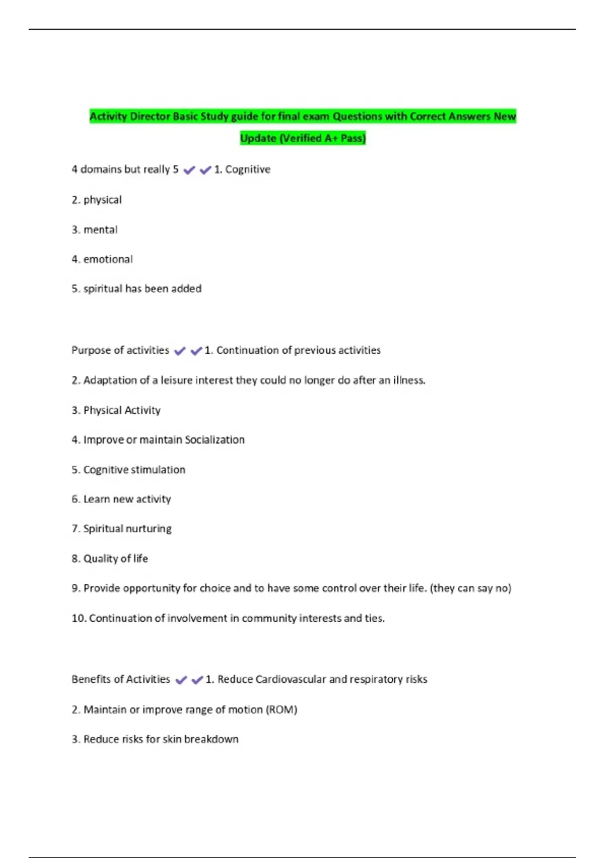 Activity Director Basic Study guide for final exam Questions with Correct Answers New Update (Verified A+ Pass)