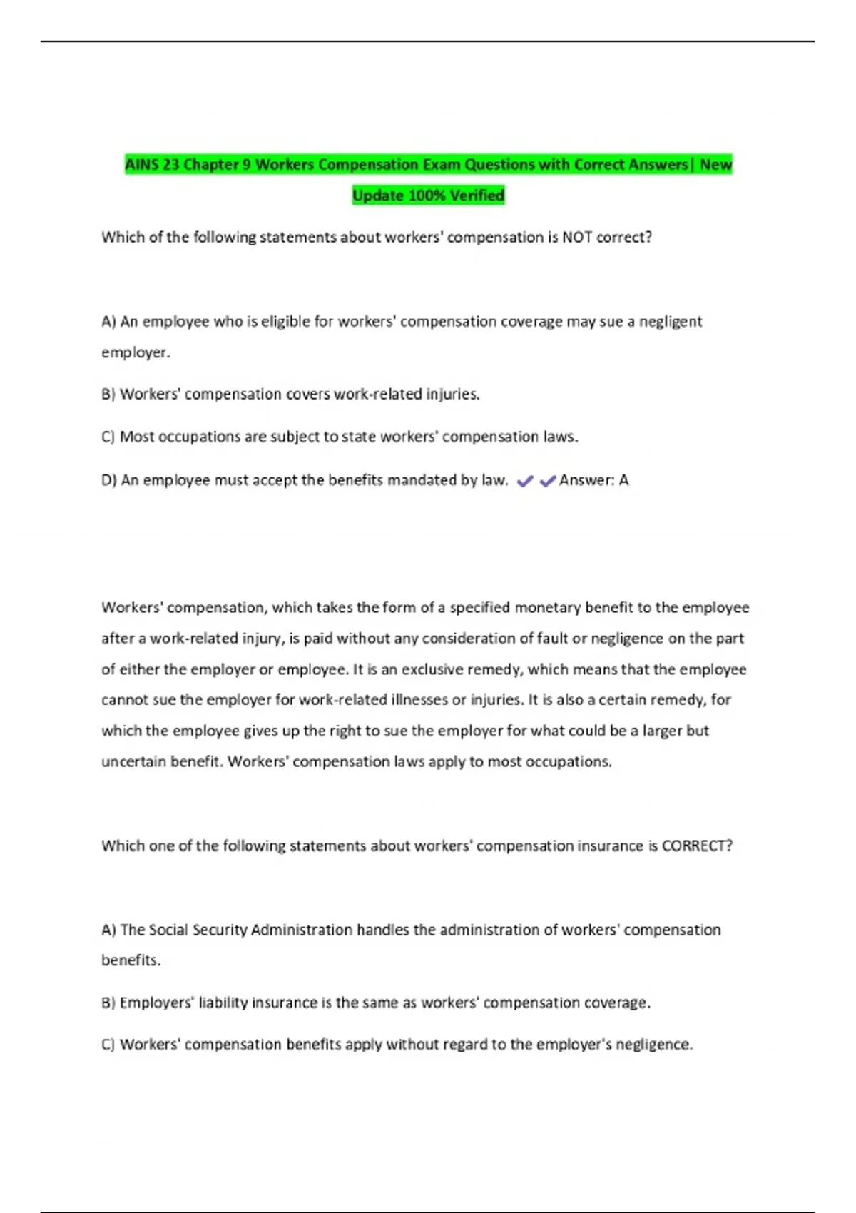AINS 23 Chapter 9 Workers Compensation Exam Questions with Correct Answers| New Update 100% Verified