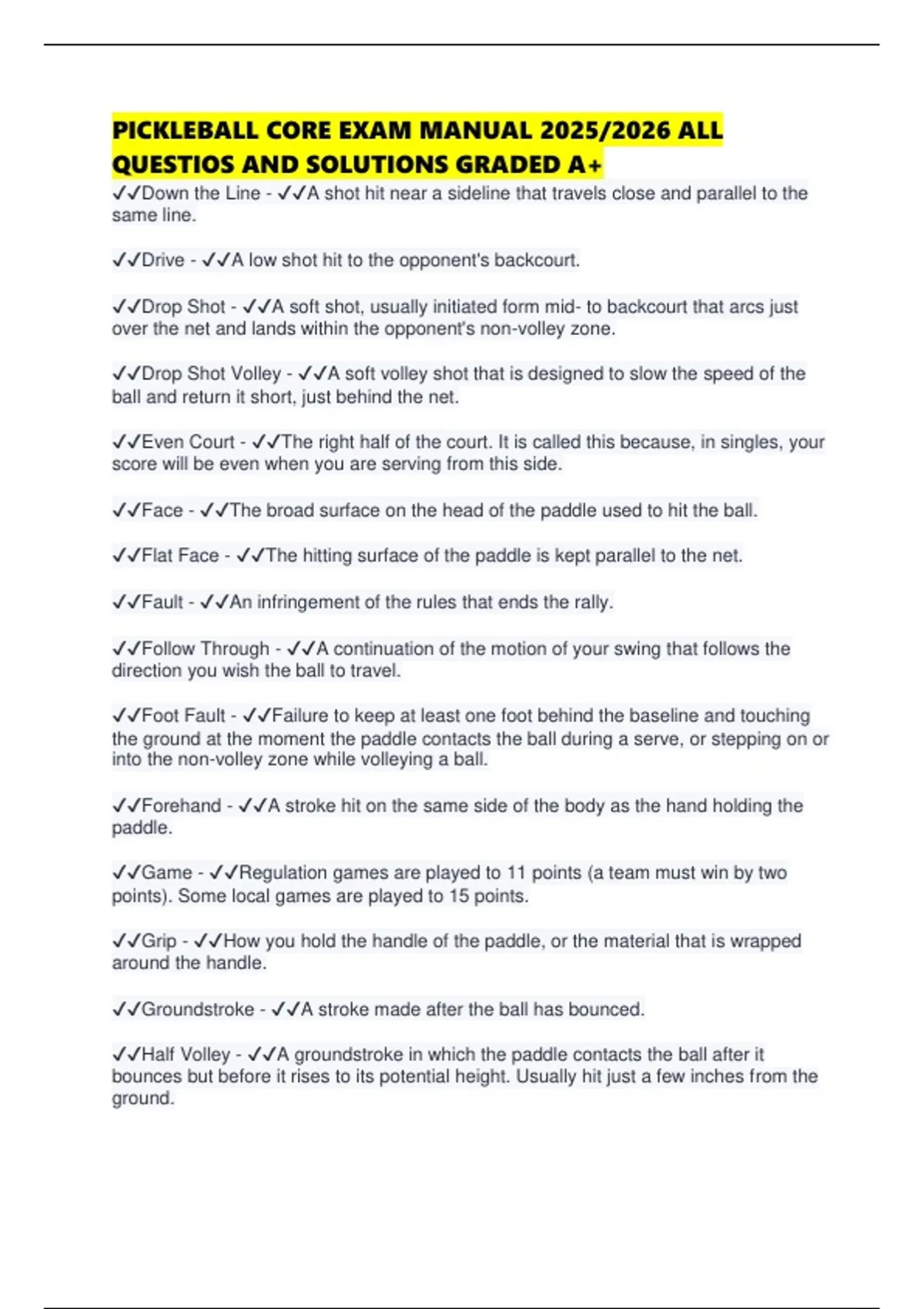 PICKLEBALL CORE EXAM MANUAL 2025/2026 ALL QUESTIOS AND SOLUTIONS GRADED A+