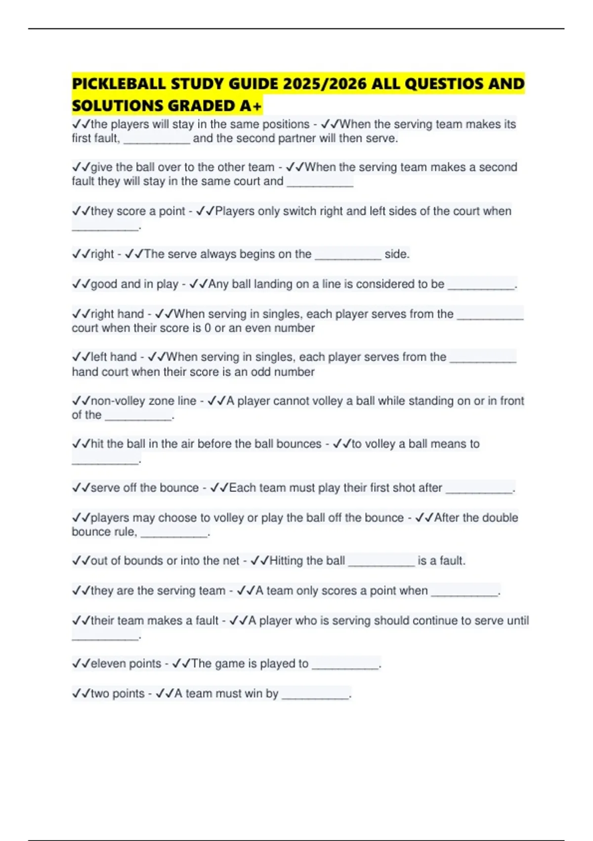 PICKLEBALL STUDY GUIDE 2025/2026 ALL QUESTIOS AND SOLUTIONS GRADED A+
