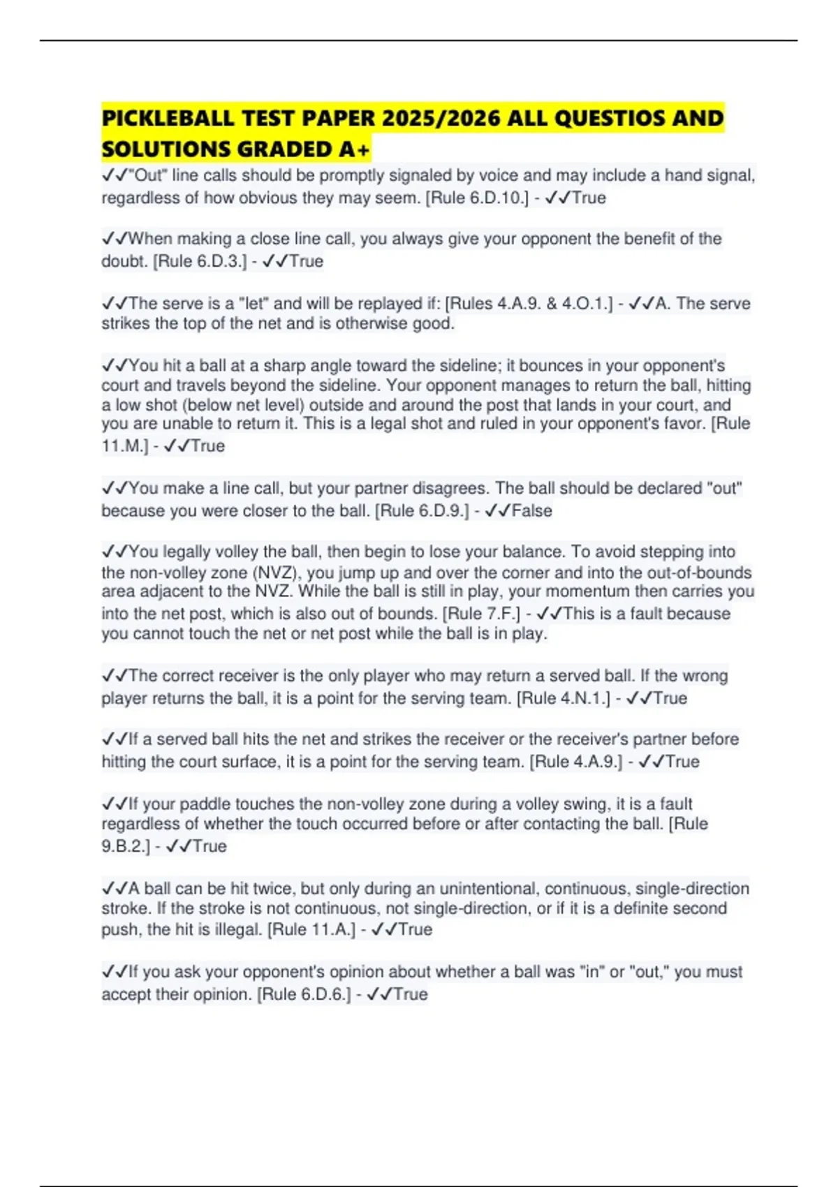 PICKLEBALL TEST PAPER 2025/2026 ALL QUESTIOS AND SOLUTIONS GRADED A+