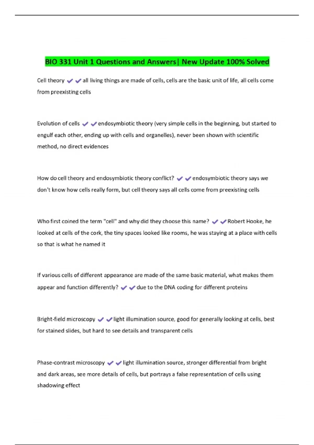 BIO 331 Unit 1 Questions and Answers| New Update 100% Solved