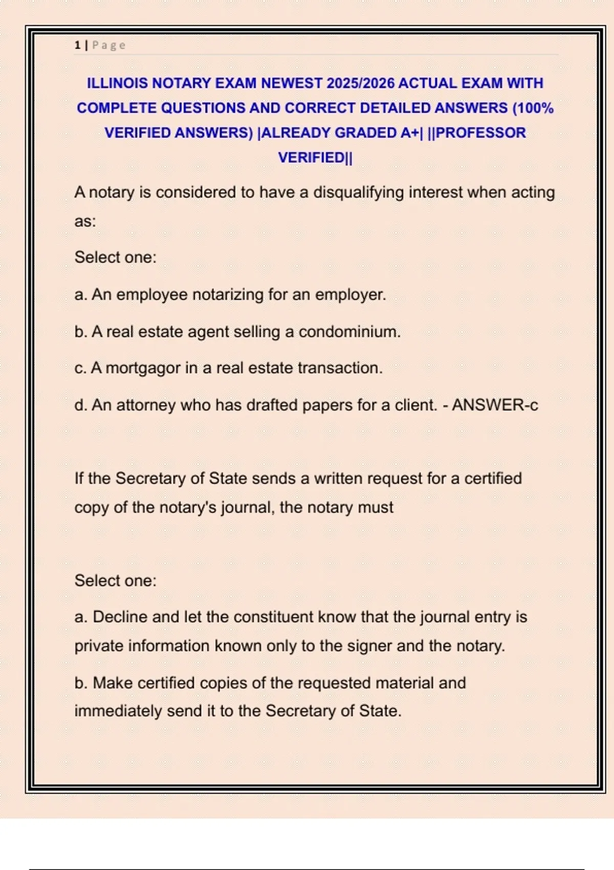 ILLINOIS NOTARY EXAM NEWEST 2025/2026 ACTUAL EXAM WITH