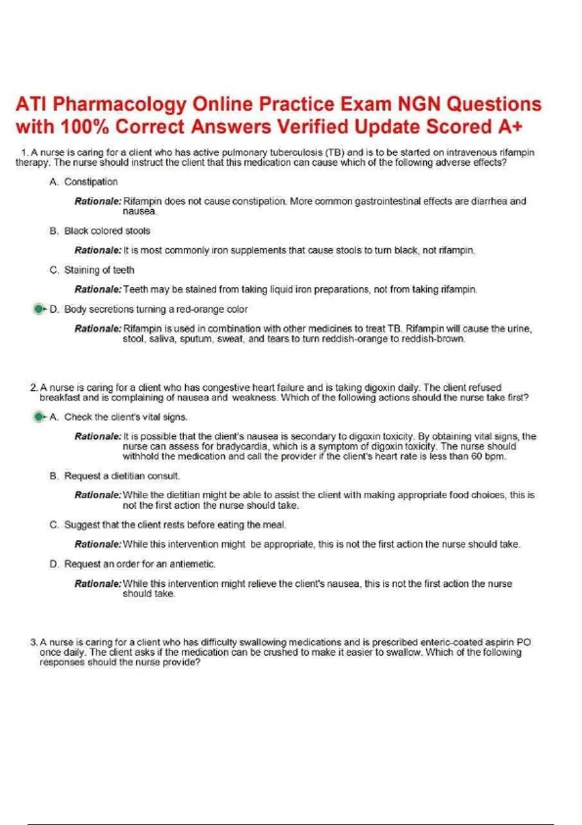 Are you preparing for the ATI Pharmacology Exam and want to boost your confidence with real exam-style practice? This ATI Pharmacology Online Practice Exam comes with Next Generation NCLEX (NGN) style questions and 100% verified correct answers—helping you study smarter, not harder. This updated 2025 version has been carefully crafted by nursing professionals and top-performing students who scored A+ using this same resource. It covers all the essential pharmacology concepts tested in ATI, including: Drug classifications and mechanisms of action Adverse effects, contraindications, and drug interactions Dosage calculations and safe medication administration Nursing interventions and patient education Each question comes with rationales and explanations, ensuring you understand why the answer is correct, not just what the answer is. With NGN-style case studies, multiple-response items, and real-world clinical scenarios, this test bank mirrors the current ATI exam format—so you’ll be fully prepared on test day. Perfect for nursing students, test-prep tutors, and anyone looking for a comprehensive ATI Pharmacology study guide, this resource will help you save time, reduce stress, and secure higher scores.