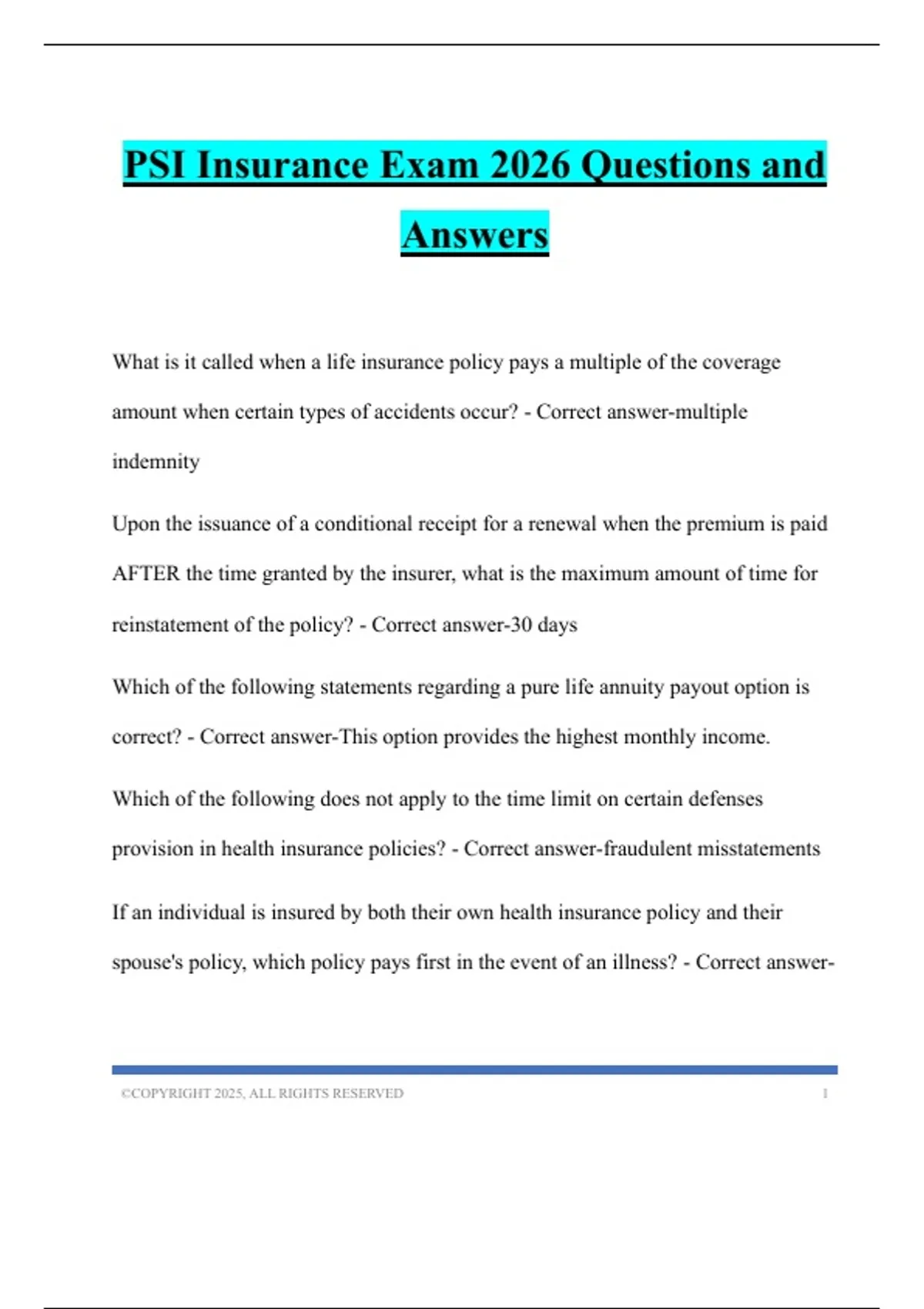 PSI Insurance Exam 2026 Questions and